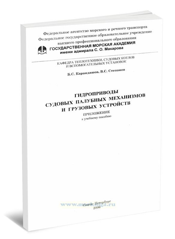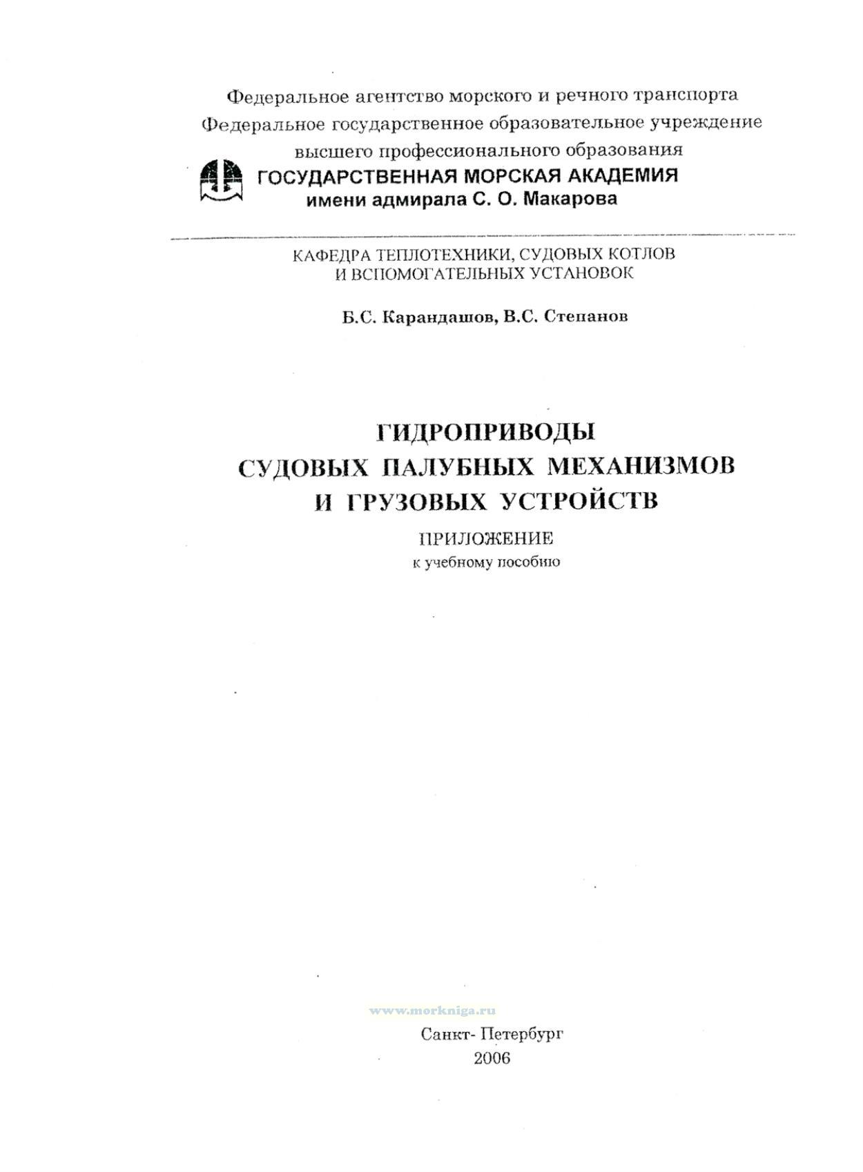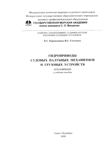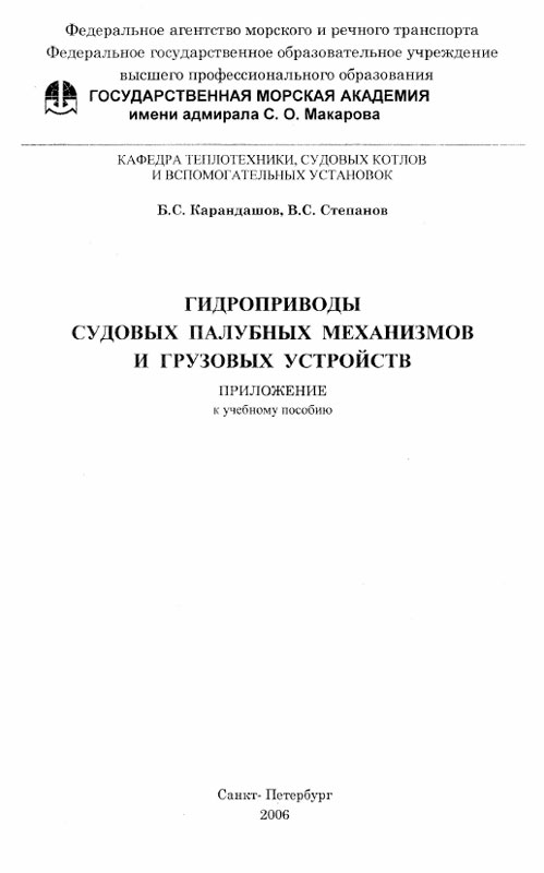 В учебном пособии рассмотрены примеры применения объемных гидроприводов для якорных и швартовных механизмов, буксирных лебедок, грузового крана, механизмов люкового закрытия грузовых трюмов, грузовой аппарели и кормовых ворот судна. Составлено описание оборудования и управления действием гидроприводов. Предназначено для курсантов и студентов заочного обучения по специальностям 240500 "Эксплуатация судовых энергетических установок", 240200 "Судовождение" и 240100 "Организация перевозок и управление на транспорте", а также может быть использовано при дополнительной подготовке судовых специалистов по вопросам оборудования и эксплуатации объемных гидроприводов. Рекомендовано к изданию на заседании кафедры "Теплотехника, судовые котлы и вспомогательные установки". Протокол № 11 от 28 апреля 2003 г.