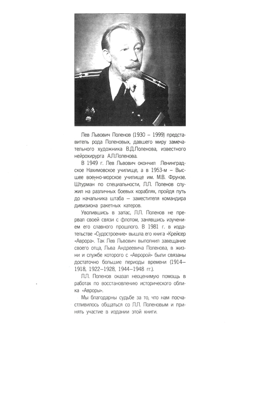 Именно это стало основной темой второй книги Л.Л. Поленова об "Авроре". Первая вышла в 1987 г. в издательстве "Судостроение". Впервые рассказывается о реконструкции крейсера и впервые публикуются уникальные фотографии из семейного архива Поленовых.