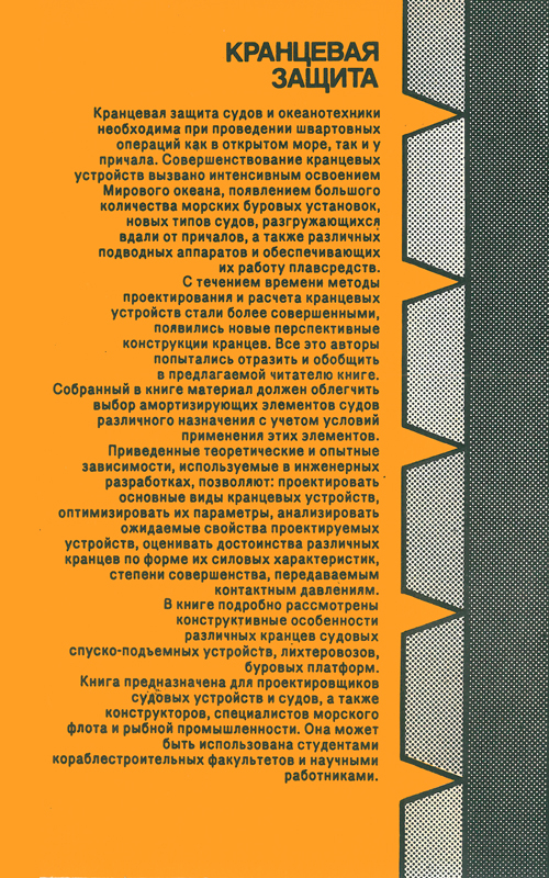 В книге рассматриваются традиционные и новые (перспективные) разновидности кранцевых устройств, обеспечивающих безопасную работу судов, средств океанотехники, спуско-подъемных устройств. Изложены основы их проектирования и выбора конструкции. Для конструкторов, работников морского и рыбопромыслового флота, студентов и аспирантов кораблестроительных факультетов.