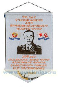 Вымпел 70 лет учреждения дня ВМФ СССР. 105 лет Главкому ВМФ СССР Адмиралу флота СССР И.Г. Кузнецову изготовлен из атласного материала. Размер вымпела: ширина 16 см высота 23 см Изготовлен частным мастером в г. Севастополе