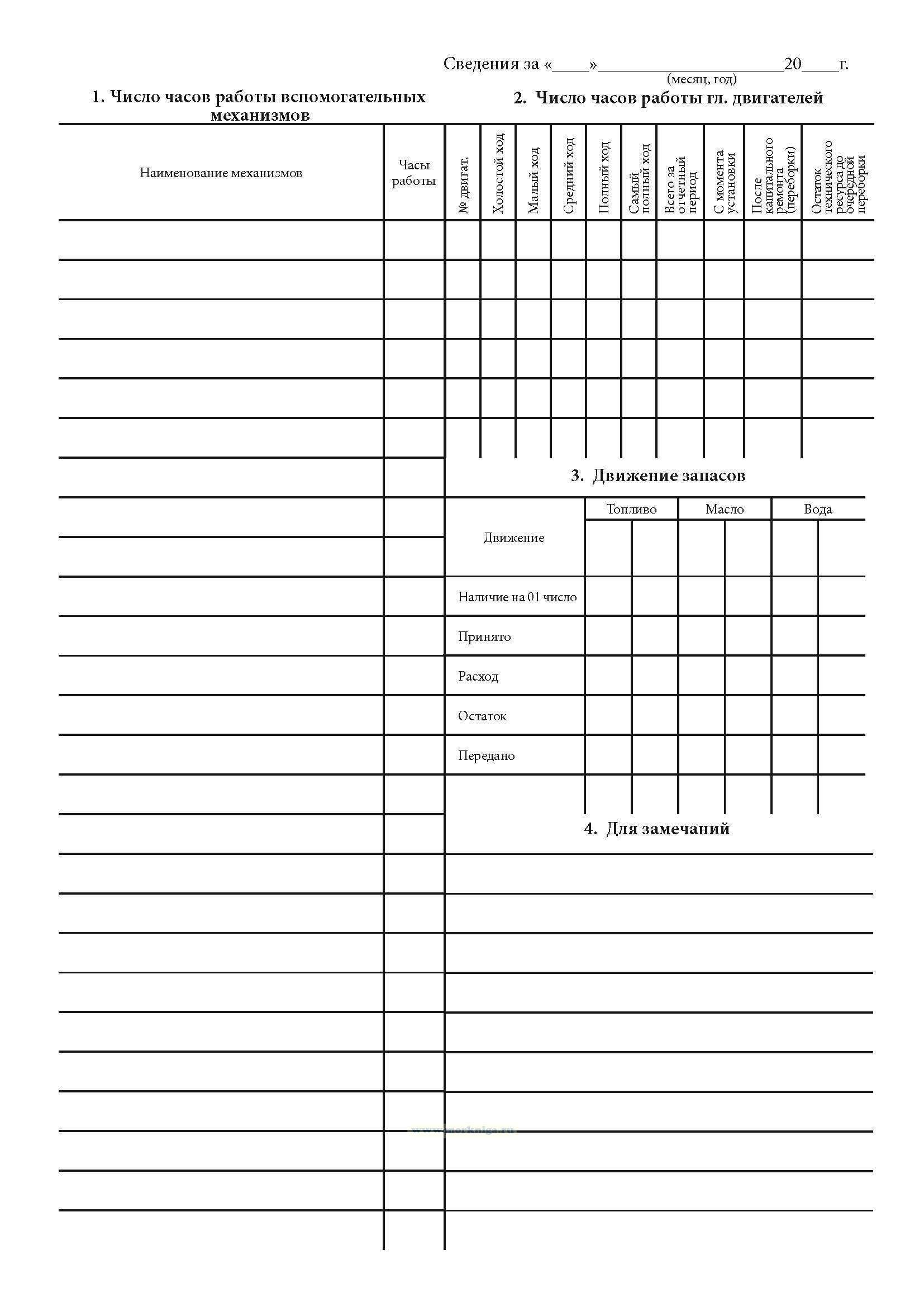 9. В раздел «Месячные отчеты» записываются за каждый истекший месяц количество часов работы главных двигателей, вспомогательных механизмов, движение ГСМ нарушение сроков ППО и ППР. выявленные недостатки и т. д.