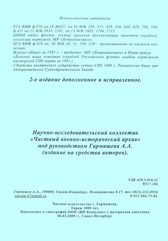 В данной работе мы постарались реконструировать облик ЭБР "Петропавловск" и именно его на момент прибытия в Порт-Артур в конце 1902 года. Обращаем Ваше внимание, что ряд элементов мог быть заменен в ходе боевых действий. Например: паровые катера были сняты со всех кораблей Порт-Артурской эскадры и составили отдельный катерный сторожевой отряд; все шлюпки были разбиты огнем противника и также убраны с кораблей; малокалиберная артиллерия передавалась на сухопутный фронт; окраска кораблей также менялась, известен факт перекраски Порт-Артурской эскадры в серо-зеленый оливкового оттенка цвет, точный колер которого неизвестен.