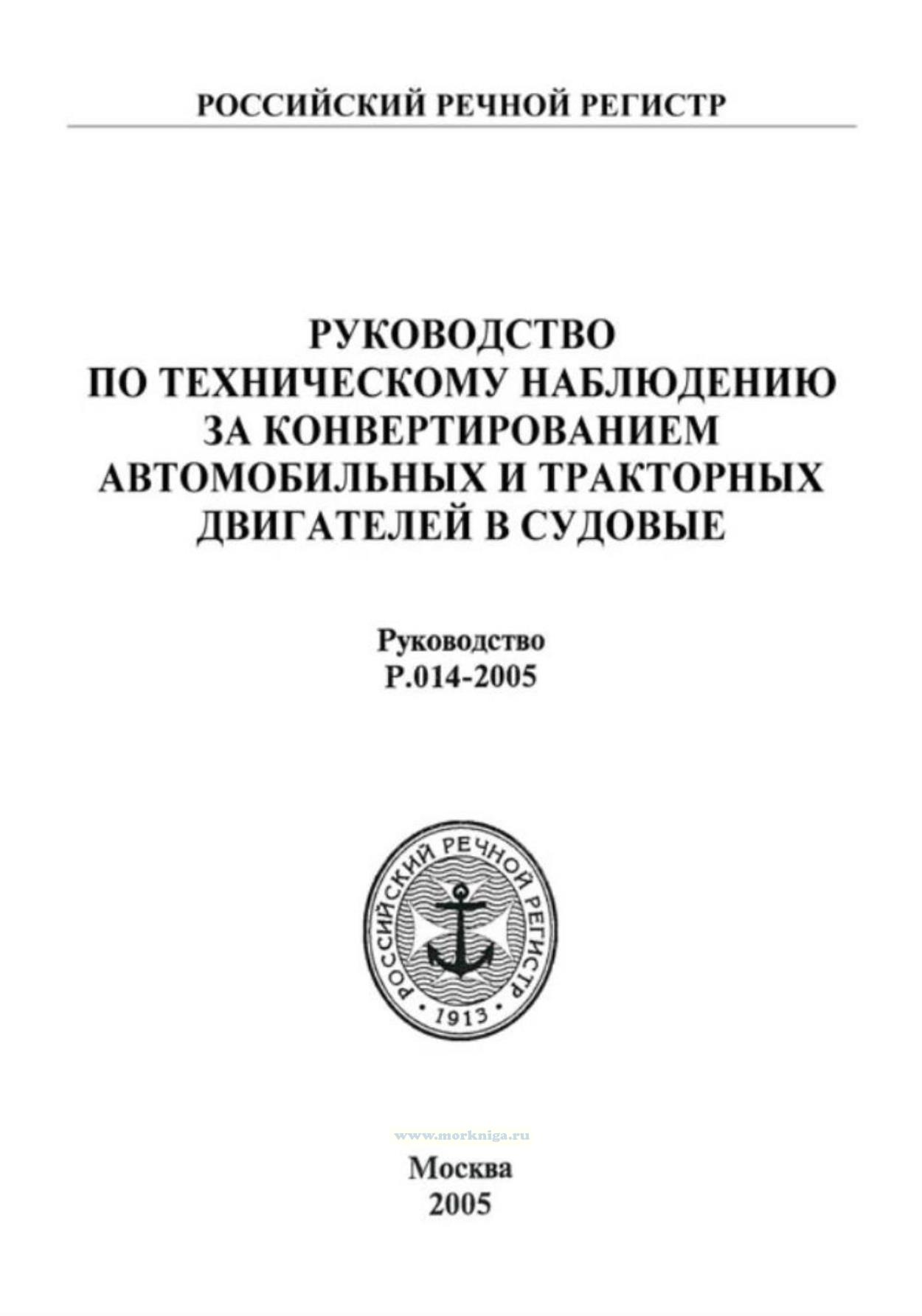 Предлагаемое Руководство разработано Главным управлением федераль ного государственного учреждения "Российский Речной Регистр" (дале РРР) при участии Верхне-Волжского, Обь-Иртышского, Северо-Западног филиалов РРР на основе Правил РРР и отмененного в настоящее врем ОСТ 5.4157-75 "Конверсия автомобильных и тракторных двигателей в судовые главные. Технические требования". Руководство является вспомогательным материалом к Правилам РРР и предназначено для оказания методической помощи специалистам РРР при рассмотрении и согласовании технической документации на проведение конверсионных работ, осуществлена технического наблюдения в процессе их производства, проведением испытаний конвертированных двигателей.