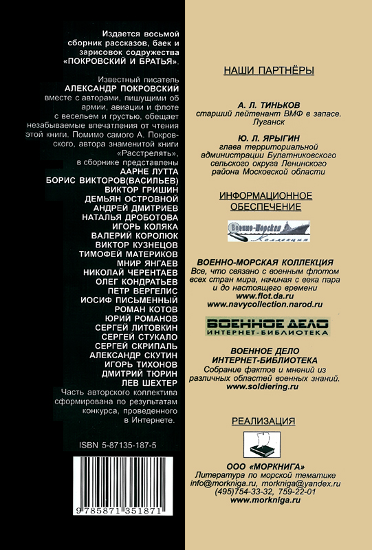 Известный писатель Александр Покровский вместе с авторами, пишущими об армии, авиации и флоте с весельем и грустью, обещает незабываемые впечатления от чтения этой книги. Помимо самого А.Покровского, автора знаменитой книги "... Расстрелять!", в сборнике представлены Аарне Лутта, Борис Викторов(Васильев), Виктор Гришин, Демьян Островной, Андрей Дмитриев, Наталья Дроботова, Игорь Коляка, Валерий Королюк, Виктор Кузнецов, Тимофей Материков, Мнир Янгаев, Николай Черентаев, Олег Кондратьев, Петр Вергелис, Иосиф Письменный, Роман Котов, Юрий Романов, Сергей Литовкин, Сергей Стукало, Сергей Скрипаль, Александр Скутин, Игорь Тихонов, Дмитрий Тюрин, Лев Шехтер.