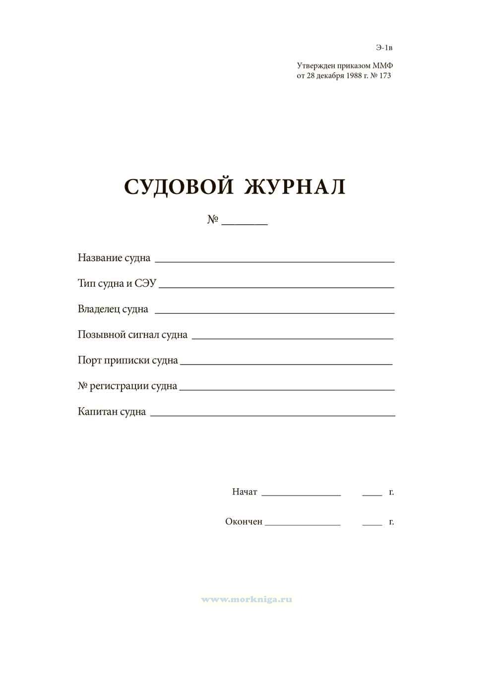 Форма судового журнала Э-1 в утверждена Приказом Минморфлота СССР от 28.12.1988 N 173 "Об утверждении новой формы судового журнала и Правил его ведения", применение судового журнала (форма Э-1 в) было разъяснено Приказом Минтранса РФ от 12.02.1999 N 6.