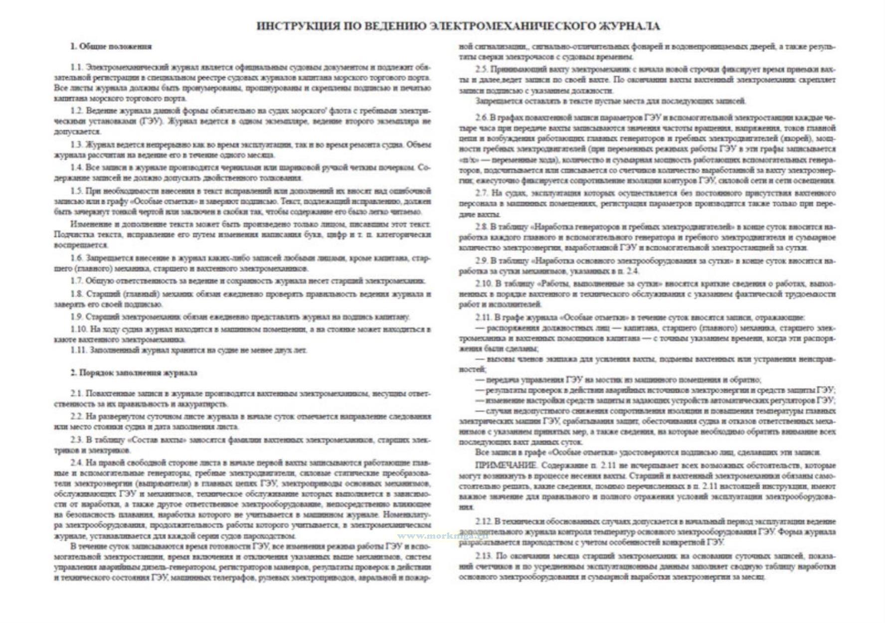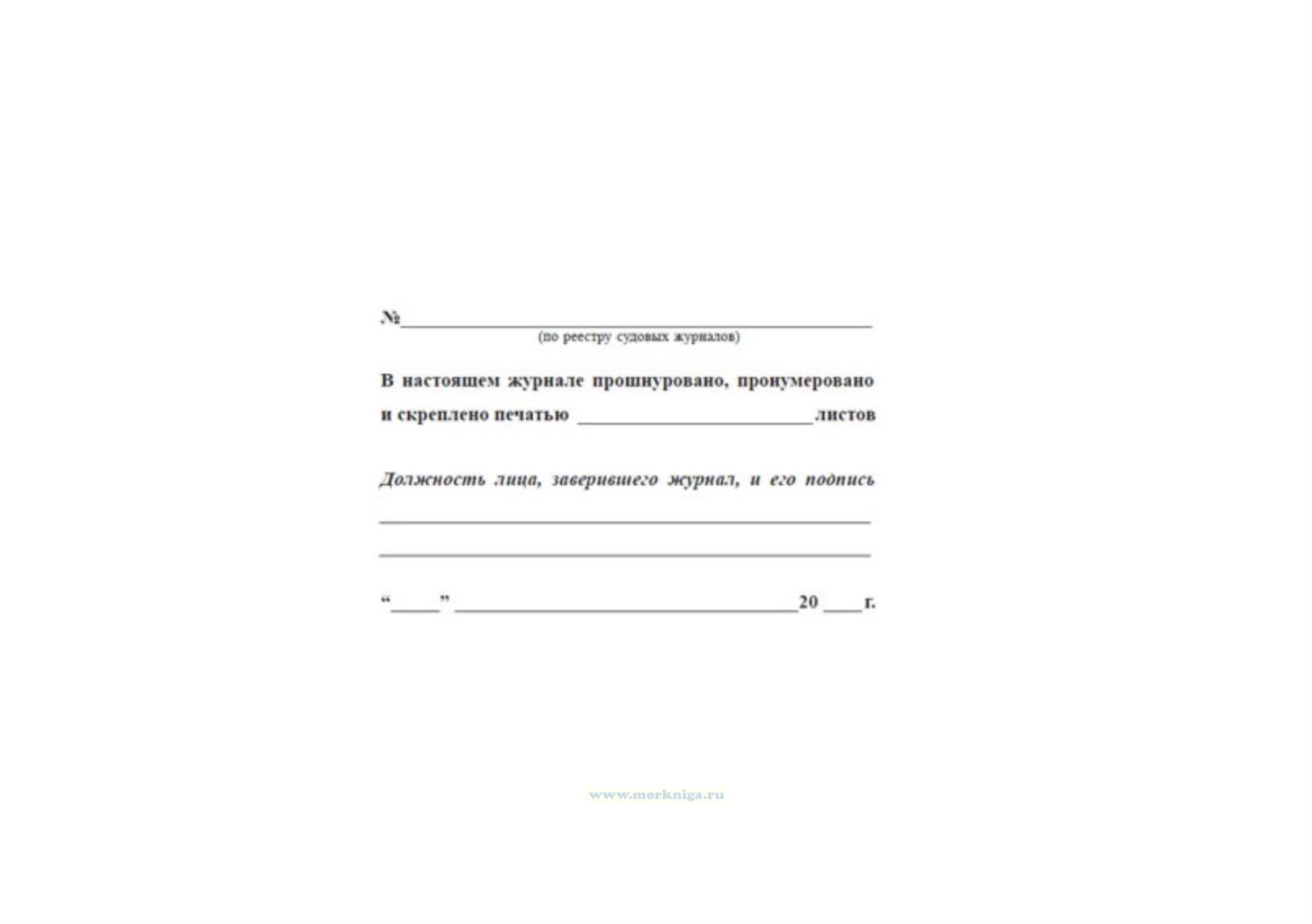 1.1. Электромеханический журнал является официальным судовым документом и подлежит обязательной регистрации в специальном реестре судовых журналов капитана морского торгового порта. Все листы журнала должны быть пронумерованы, прошнурованы и скреплены подписью и печатью капитана морского торгового порта.
