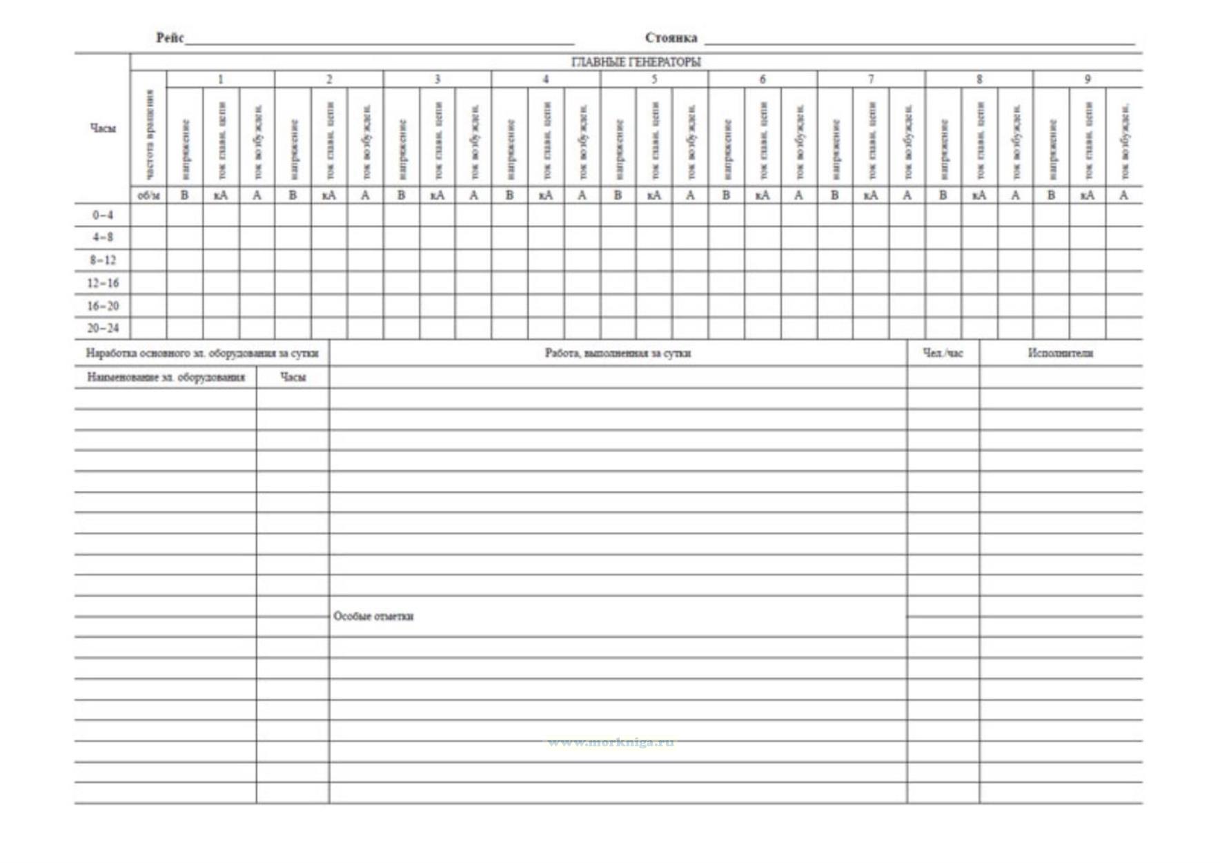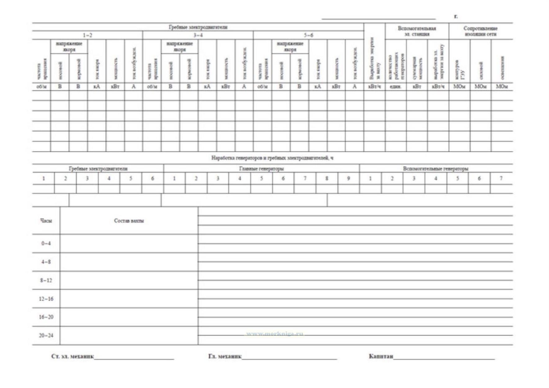 2.4. На правой свободной стороне листа в начале первой вахты записываются работающие главные и вспомогательные генераторы, гребные электродвигатели, силовые статические преобразователи электроэнергии (выпрямители) в главных цепях ГЭУ, электроприводы основных механизмов, обслуживающих ГЭУ и механизмов, техническое обслуживание которых выполняется в зависимости от наработки, а также другое ответственное электрооборудование, непосредственно влияющее па безопасность плавания, наработка которого не учитывается в машинном журнале. Номенклатура электрооборудования, продолжительность работы которого учитывается, в электромеханическом журнале, устанавливается для каждой серии судов пароходством.