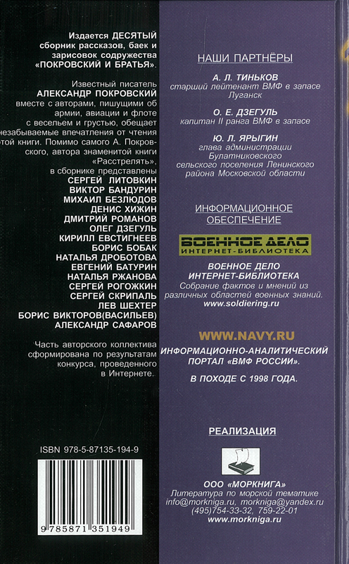Известный писатель Александр Покровский вместе с авторами, пишущими об армии, авиации и флоте с весельем и грустью, обещает незабываемые впечатления от чтения этой книги.