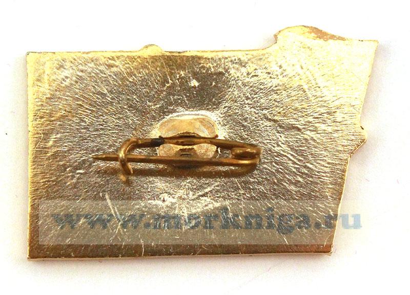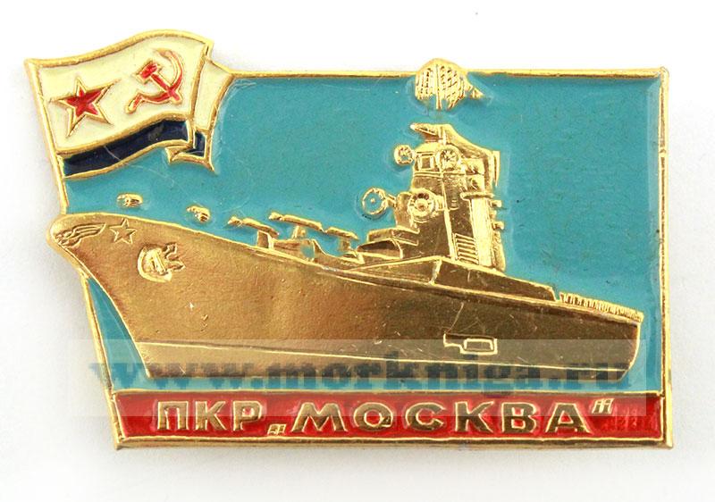 По центру знака на голубом фоне объемное изображение крейсера. В левом верхнем углу размещен флаг ВМФ СССР. Снизу на красном фоне надпись – ПКР «Москва».