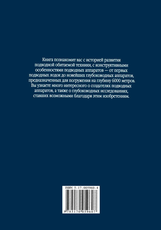 В книге описывается история развития подводной обитаемой техники, а также конструктивные особенности отдельных подводных аппаратов, от первых подводных лодок до новейших глубоководных, предназначенных для погружения на глубину 6000 м. Приводится интересный материал о создателях подводных аппаратов и глубоководных исследованиях, ставших возможными благодаря этим изобретениям. Книга рассчитана на широкий круг читателей. Автор развивает тему подводных обитаемых аппаратов в своих следующих книгах: Телеуправляемые необитаемые подводные аппараты + CD и Автономные необитаемые подводные аппараты.