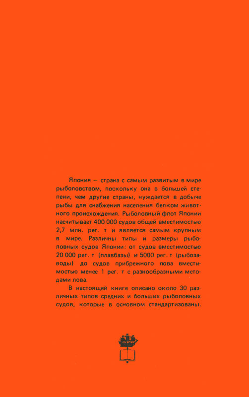 Подробно описаны около 30 типов промысловых судов, эксплуатируемых в настоящее время в Японии. Приведены данные об основном промысловом оборудовании, поясненные схемами его работы. Брошюра снабжена приложениями, освещающими количественный и качественный состав современного японского промыслового флота, а также наглядными и информативными иллюстрациями. Адресована проектантам и эксплуатационникам промыслового флота, а также читателям, интересующимся проблемами промысла рыбы.
