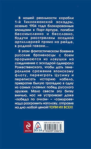 В этом фантастическом боевике русские броненосцы с боем прорываются из ловушки на соединение с эскадрой адмирала Рожественского, чтобы дать генеральное сражение японскому флоту, переиграть Цусиму и переписать историю набело, превратив былую трагедию в одну из самых славных побед русского оружия. Мало свести эту битву вничью, нас не устраивает даже «победа по очкам» - «самураев» надо разгромить наголову, отправив на дно любой ценой! ТОПИ ИХ ВСЕХ!
