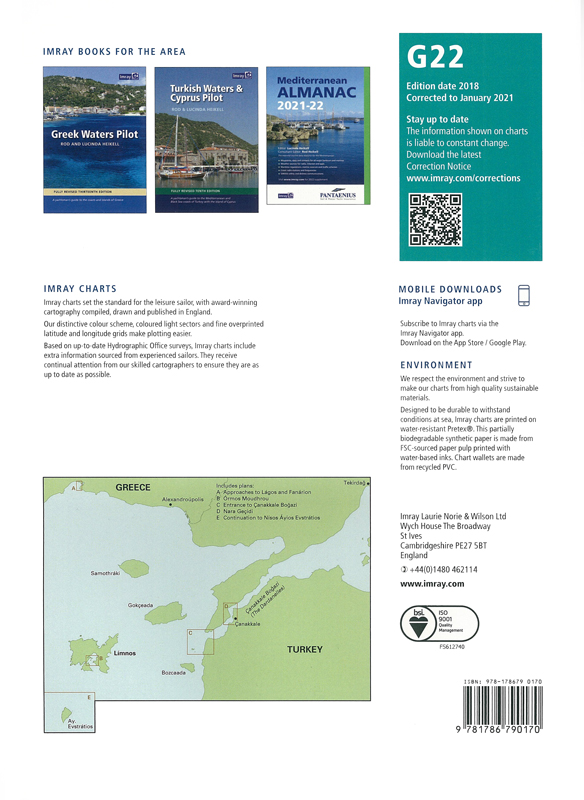 The scale and coverage of the chart has been adapted from official charts to the requirements of small boat users under the direction of Rod Heikell with additional information on navigation and harbours from his own surveys. For additional pilotage information on the area see Rod Heikell's pilots published by Imray, Laurie, Norie & Wilson Ltd. These are listed on the face of the chart. Any information that adds to the accuracy or improvement of this chart is welcomed by the publishers.