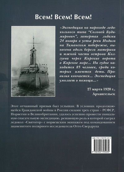Автор книги - непосредственный участник этой экспедиции - рассказывает о том, как готовилась и проводилась эта уникальная для своего времени операция, за ходом которой следил весь мир. Наряду с этим читатель познакомится с бытом обитателей русской колонии на Новой Земле и узнает о судьбах некоторых пассажиров «Соловья Будимировича» в переломный период отечественной истории.