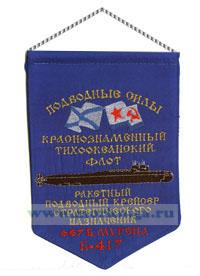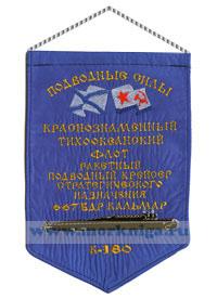 Вымпел Ракетный подводный крейсер стратегического назначения 667 БДР Кальмар К-180 КТОФ изготовлен из атласного материала. Размер вымпела: ширина 16 см высота 23 см Изготовлен частным мастером в г. Севастополе