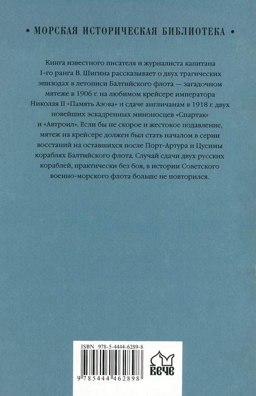 Книга известного писателя и журналиста капитана 1-го ранга В. Шигина рассказывает о двух трагических эпизодах в летописи Балтийского флота - загадочном мятеже в 1906 г. на любимом крейсере императора Николая II Память Азова и сдаче англичанам в 1918 г. двух новейших эскадренных миноносцев «Спартак» и «Автроил». Если бы не скорое и жестокое подавление - мятеж на крейсере должен был стать началом серии восстаний на оставшихся после Порт-Артура и Цусимы кораблях Балтийского флота. Случай сдачи двух русских кораблей, практически без боя, в истории Советского военно-морского флота больше не повторился.