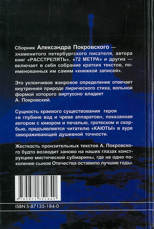 Сущность краевого существования героя "в глубине вод и чреве аппаратов", показанная автором с юмором и печалью, гротеском и скорбью, предъявляется читателю "КАЮТЫ" в ауре завораживающей душевной точности. Жесткость пронзительных текстов А. Покровского будто возводит заново на наших глазах конструкцию мистической субмарины, где ни одно поколение сынов Отечества оставило лучшие годы.