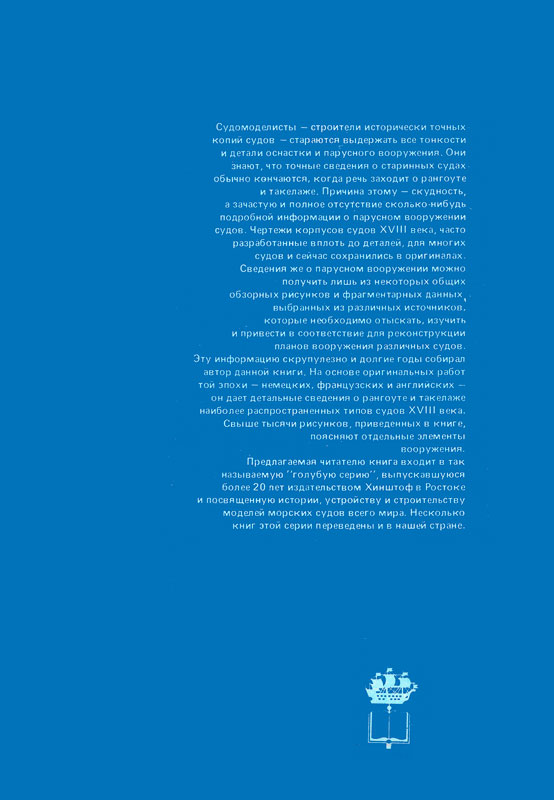 Книга представляет собой фундаментальное пособие для судомоделистов. Описываются рангоут и такелаж военных и торговых судов XVIII в. разных размеров. Представлено большое количество рисунков. Для судомоделистов, руководителей судомодельных кружков и интересующихся историей развития флота.