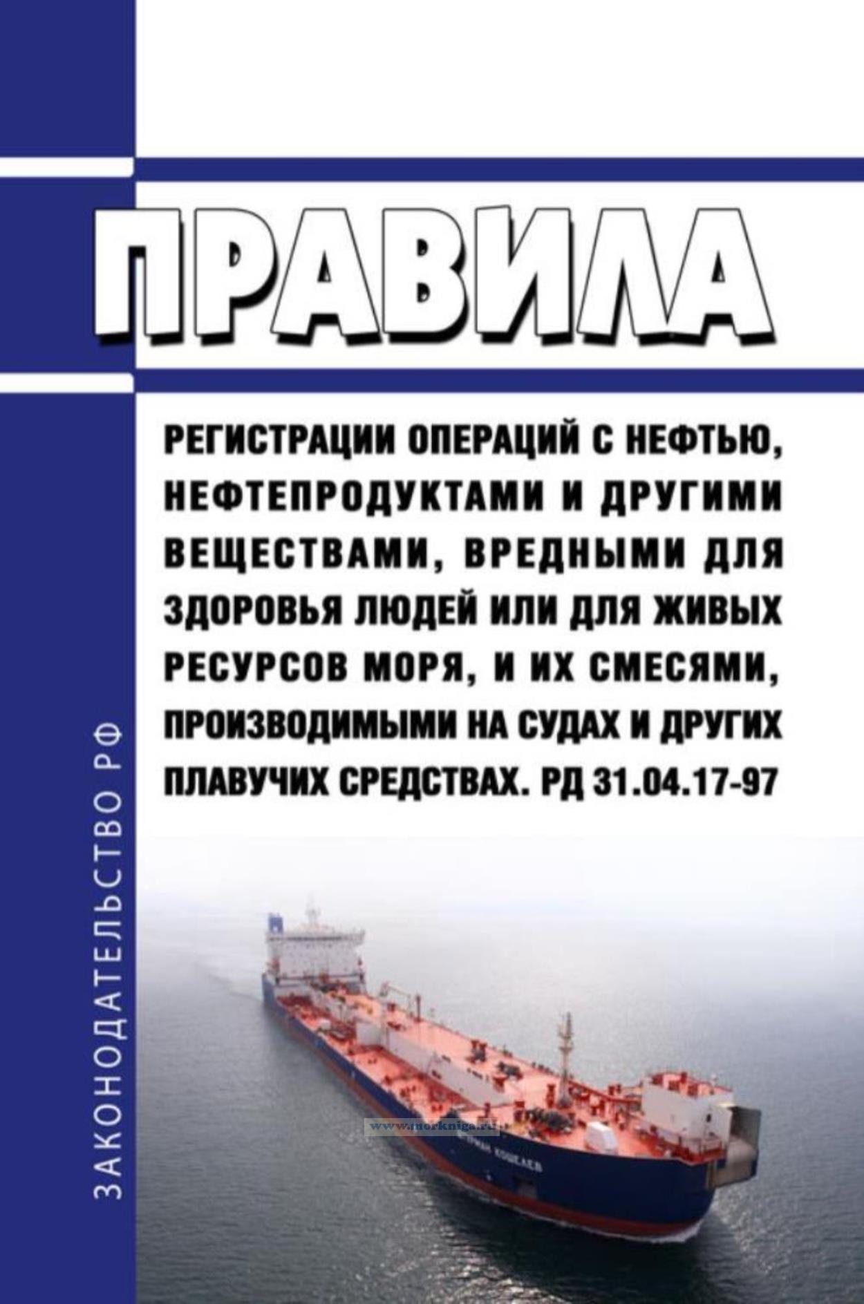 Правила регистрации операций с нефтью, нефтепродуктами и другими веществами, вредными для здоровья людей или для живых ресурсов моря, и их смесями, производимыми на судах и других плавучих средствах. РД 31.04.17-97 устанавливают единый порядок регистрации в судовых документах операций с нефтью, нефтепродуктами и другими веществами, вредными для здоровья людей или для живых ресурсов моря, и их смесями (включая хозяйственно-фекальные воды и мусор), производимыми на судах и других плавучих средствах как в пределах внутренних морских и территориальных вод России, так и в открытом море.