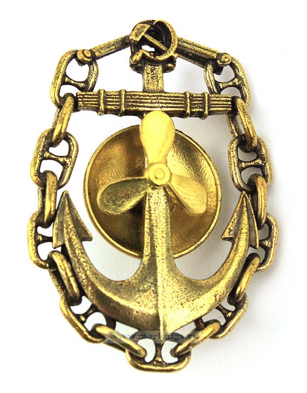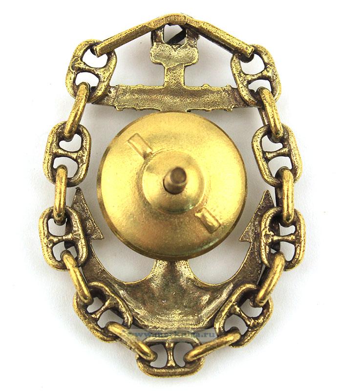 Знак имеет овальную форму, по центру якорь, вокруг которого обведена якорная цепь. В центре знака помещен накладной бронзовый гребной винт.