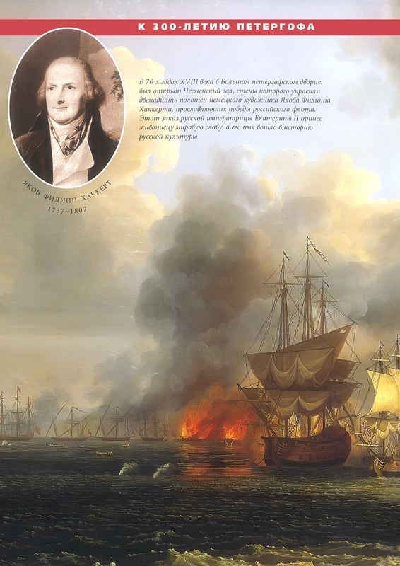 В 70-х годах XVIII века в Большом петергофском дворце был открыт Чесменский зал, стены которого украсили двенадцать полотен немецкого художника Якоба Филиппа Хаккерта, прославляющих победы российского флота. Этот заказ русской императрицы Екатерины II принес живописцу мировую славу, а его имя вошло в историю русской культуры.