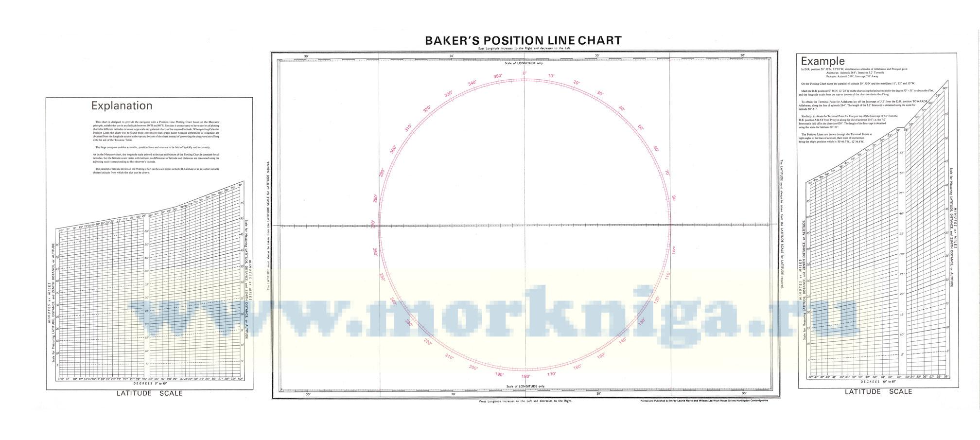 This chart is designed to provide the navigator with a Position Line Plotting Chart based on the Mercator principle, suitable for use in any latitude between 60°N and 60° S. It makes it unnecessary to have a series of plotting charts for different latitudes or to use large scale navigational charts of the required latitude. When plotting Celestial Position Lines the chart will be found more convenient than graph paper because differences of longitude are obtained from the longitude scales at the top and bottom of the chart instead of converting the departure into d'long with the aid of the Traverse Table.