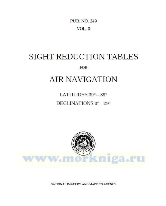 These tables, designated as Volume 3 of the three-volume series of Pub. No. 249, Sight Reduction Tables for Air Navigation, together with the similar Volume 2, supplement Volume 1 containing tabulations for selected stars. They together contain values of the altitude (to the nearest minute) and the azimuth angle (to the nearest degree) for integral degrees of declination from 29??north to 29??south, for the complete range of latitude and for all hour angles at which the zenith distance is less than 95° (97° between latitudes 70° and the poles); provision is made for interpolation for declination. As in Volume 1, no correction for refraction has been included in the tabulated altitudes; azimuth angle is given in contrast to the azimuth for the selected stars. Volume 2 caters for latitudes 0°-40° and Volume 3 for latitudes 39°-89°; they are divided purely for convenience in handling, and are otherwise similar in all respects.