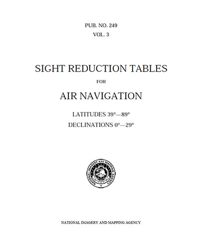 The Sight Reduction Tables for Air Navigation consist of three volumes of comprehensive tables of altitude and azimuth designed for the rapid reduction of astronomical sights in the air. This volume (Volume 3), for latitudes 39°-89°, and Volume 2 for latitudes 0° -40°, provide for sights of the Sun, Moon, and planets; these tables are permanent. Volume 1 contains tables for selected stars for all latitudes, calculated for a specific epoch; it is intended for use for about 5 years, when it will be replaced by a new edition based on a later epoch.