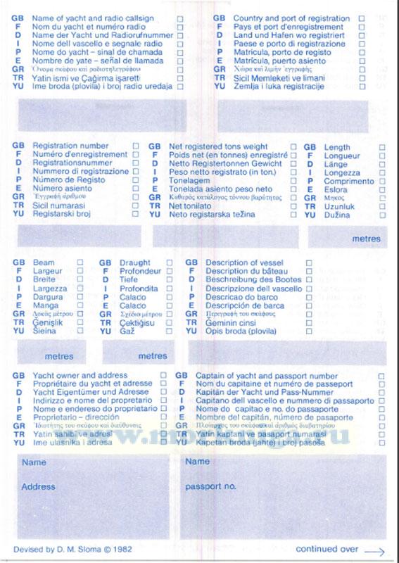 A pad of 50 forms presenting the information generally required by port officials in eight different languages. An invaluable aid to yachtsmen cruising international waters.