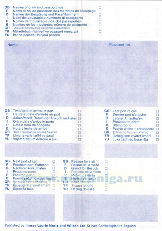 The information generally required from the Skipper of visiting yachts by port officials is listed in eight languages.