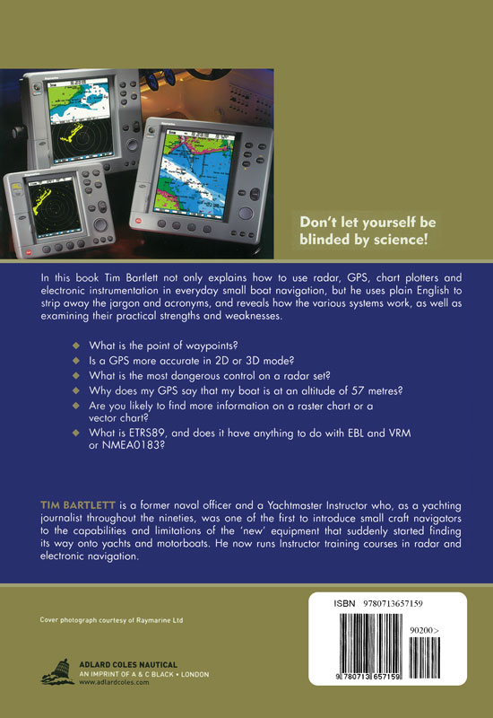 Description: he Adlard Coles Book of Navigation is aimed at anyone with an interest in navigating small craft,but particularly at those working towards RYA Day Skipper, Yachtmaster, Motor Cruising or Advanced Powerboatcertificates, or attending the RYA Radar course.Electronics have gained such widespread acceptance over the last decade that even a modest family cruiser is likely to have anelectronic navigation capability comparable with that of a small warship of twenty years ago. Using plain English to strip away thejargon, this book sets out to demystify the technology behind modern marine electronics, and to explain how the various systemswork and how to get the best out of the equipment available..