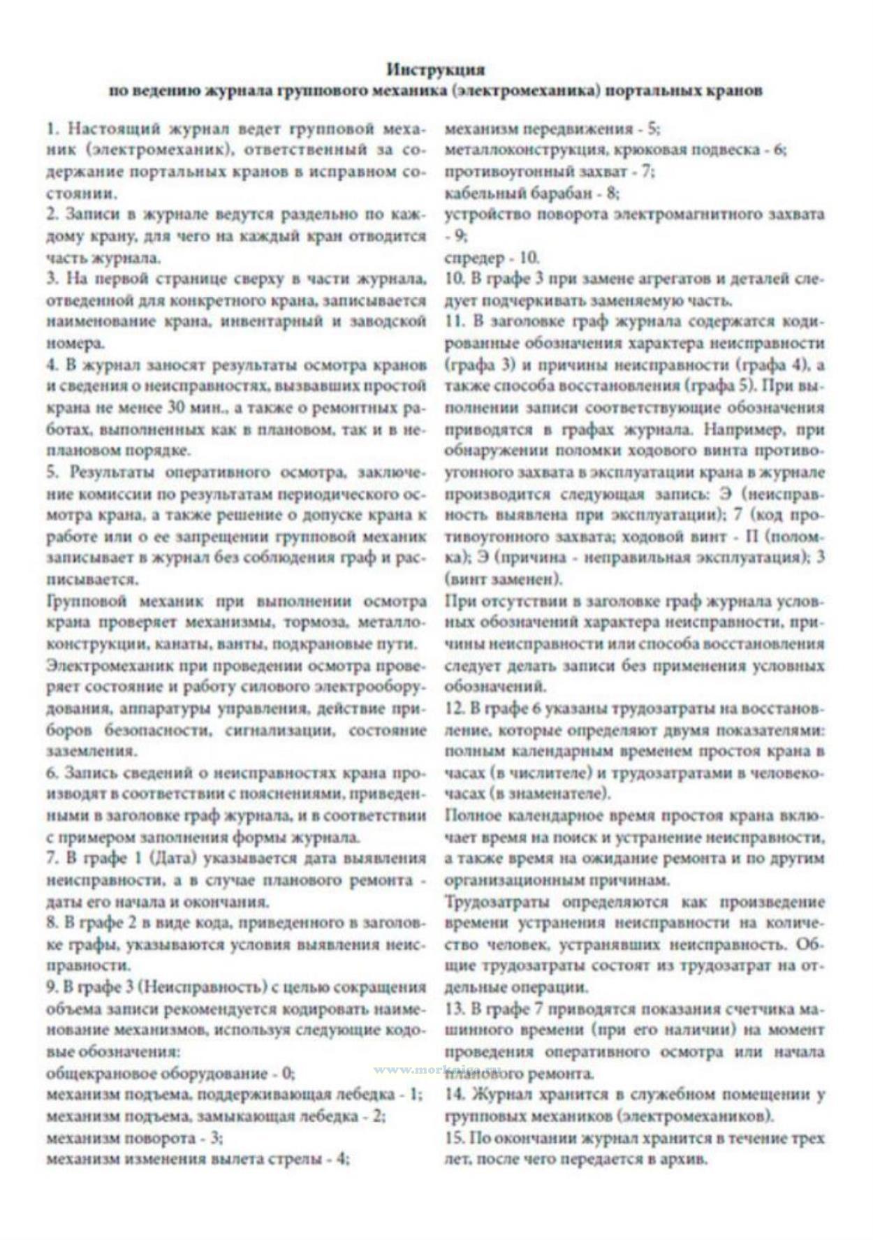 Инструкция по ведению журнала группового механика (электромеханика) портальных кранов: