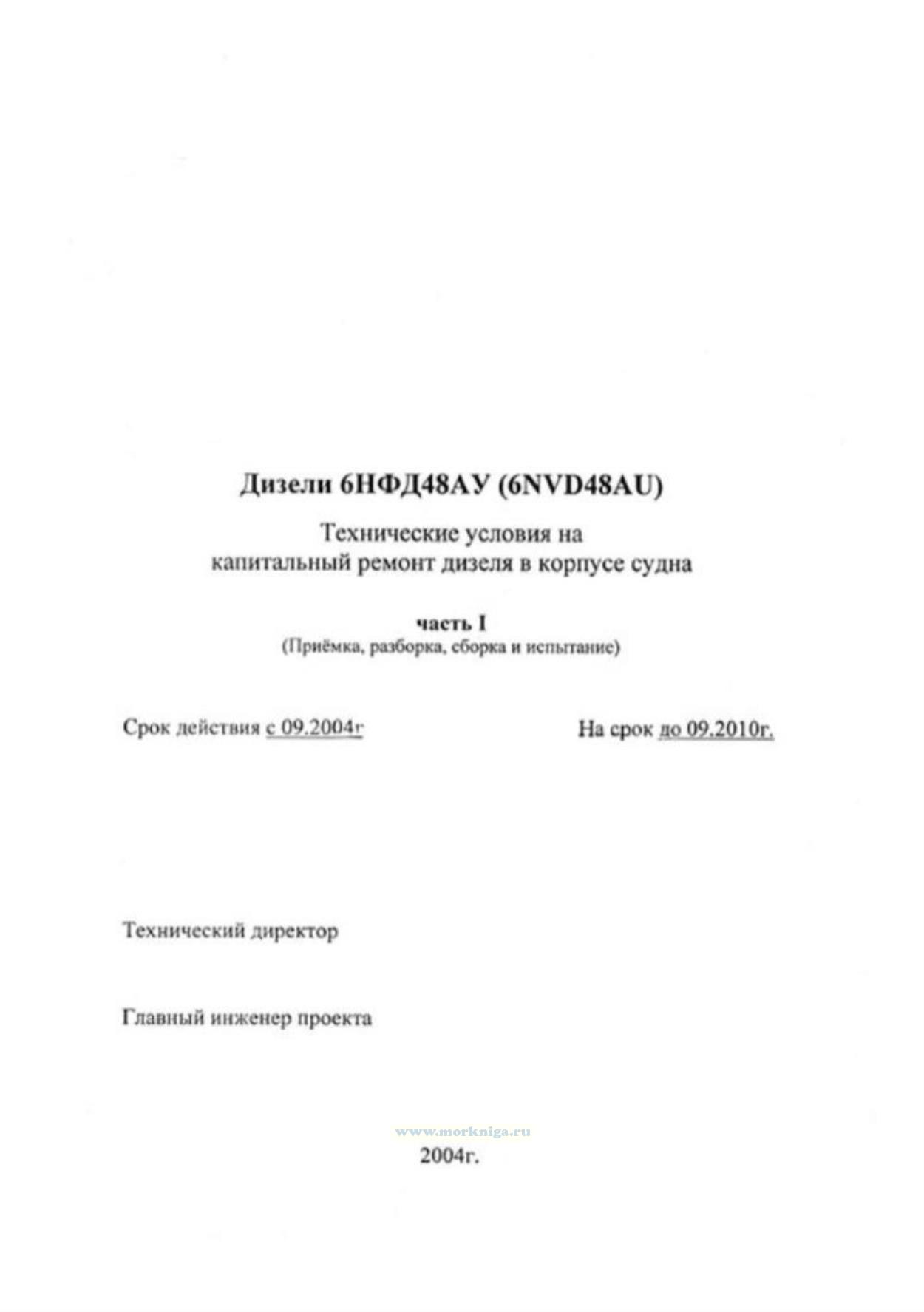 Настоящие технические условия (ТУ) распространяются на капитальный ремонт судовых дизелей 6НФД48АУ в корпусе судов, ремонтируемых на судоремонтных предприятиях.
