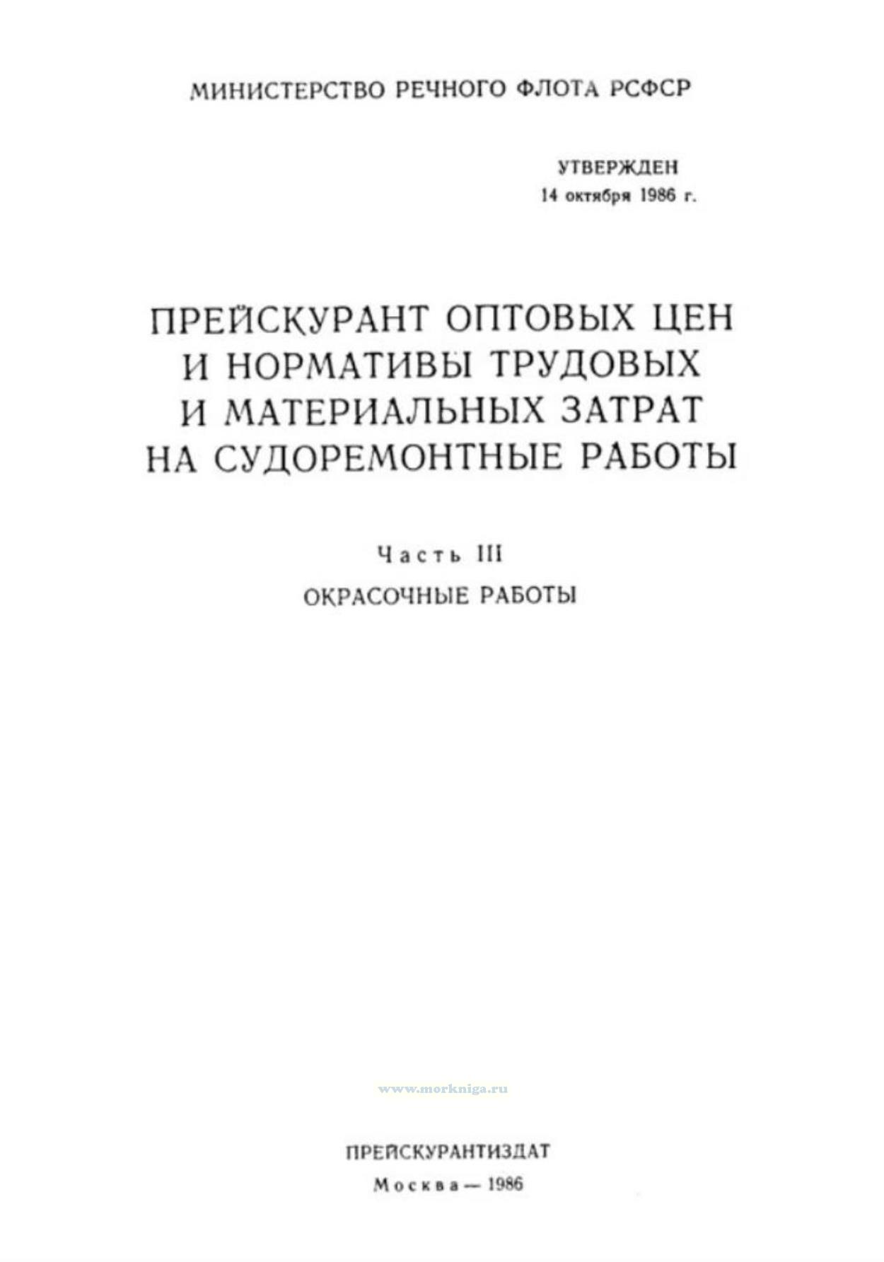 Прейскурант оптовых цен и нормативы трудовых и материальных затрат на судоремонтные работы обязателен к применению при составлении ведомостей на текущий и средний ремонт судов, на которые отсутствуют Единые ремонтные ведомости, дополнительных ведомостей, а также ведомостей и смет на навигационный, капитальный и восстановительный ремонт судов и модернизированные работы. Никаких изменений и дополнений к прейскурантным ценам и нормативам, помимо указанных в прейскуранте, вносить не разрешается.
