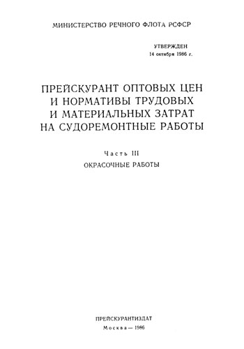Настоящий прейскурант разработан на основе РТМ 212.0100-82 «Антикоррозионная защита судов Минречфлота РСФСР. Покрытия лакокрасочные. Технические требования. Схемы окраски. Технологические процессы».