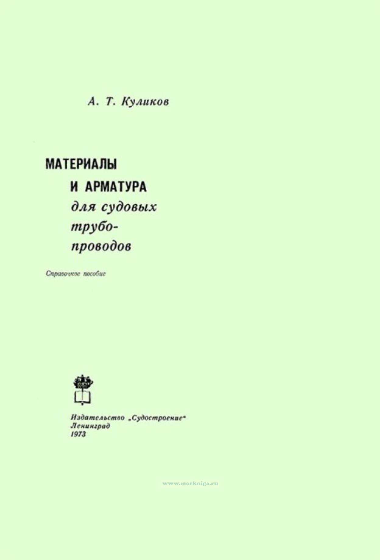 В справочном пособии обобщены и систематизированы сведения о материалах и арматуре судовых трубопроводов, даны рекомендации по их применению в зависимости от назначения трубопровода, проводимой среды и ее параметров. Приведены справочные данные о трубах, соединениях, фасонных частях и других изделиях судовых трубопроводов, их номенклатуре, конструкции и материалах, о нормализованной арматуре, ее устройстве, назначении, материалах основных деталей.