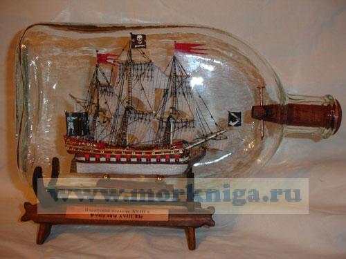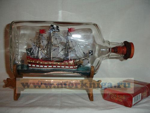 «Пиратский» корабль в бутылке – отражение достаточно мрачной, но в то же время самой романтичной части морской истории мира. После эпохи Великих географических открытий в Европу из Нового Света хлынула волна серебра и золота, опьяняя головы не только королям и герцогам, но и «работникам ножа и топора» - пиратам. Объединяясь в шайки, эти бывшие моряки, охотники, каторжники, гуляки портовых кабаков грабили на быстроходных парусных и парусно-гребных кораблях испанские каравеллы и галеоны, которые ломились от золота инков, майя и ацтеков. Захватывая чужие корабли они поднимали на них «веселый Роджер», создавая целые флотилии пиратов. Пиратские корабли бороздили моря и океаны, изменяя не только маршруты торгового судоходства того времени, но и влияя на политику Европы. Именно такой корабль в бутылке изображен, т.е. захваченный пиратами торговый корабль. У него красный кровавый борт, он как будто прокис от крови морских сражений, золотые украшение напоминают, за что она была пролита. Пиратский корабль в бутылке – морской сувенир, оригинальный подарок, подарок мужчине, обычно молодому или юноше, который знает Стивенсона, «Одиссею капитана Блада» и другое, просто интересуется темой пиратские корабли. Как пел Владимир Высоцкий об этом времени:
