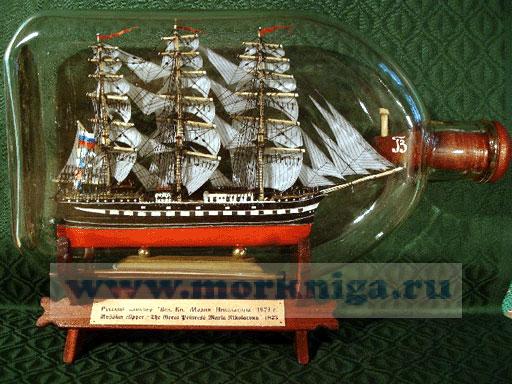 Корабль в бутылке «Великая княжна Мария Николаевна» - это деревянный корабль. То искусство, которое вы видите у англичан и китайцев, когда в бутылку помещен стеклянный корабль – это искусство стеклодувов. Стеклодув сначала делает из стекла корабль, потом обдувает его бутылкой. У меня все иначе. Я использую готовую винную или химическую посуду и собираю корабль в бутылке через горлышко. Т.е. все корабли в бутылке сделаны через горлышко. Иногда авора обвиняют в том, что он режет стекло, а потом склеивает. Ну, во-первых, в домашних условиях его не разрезать, а во-вторых, как заполировать в такой смешной версии шов внутри, когда там корабль. Обдуть деревянный корабль стеклом тоже невозможно – температура плавления стекла 696°, все моментально сгорит. Корабль в бутылке «Великая княжна Мария Николаевна» - очень красивый и романтичный морской сувенир, единственный русский клиппер классического типа. Это бывший английский клиппер «Хеспериус», построенный в 1871 году в Англии переданный России во времена Александра III-го как учебный корабль. На нем прошли морскую практику, учебные плавания многие будущие штурманы и знаменитые капитаны русского, а потом и советского флотов. Стремительность линий этого корабля вызывает ассоциацию со стихами Эдуарда Багрицкого:
