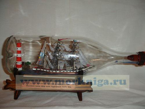 Корабль в бутылке «Русский военный корабль у маяка» - интересный и оригинальный подарок, который вы можете поставить на телевизор, в шкаф, подарить человеку, связанному с морем или просто любителю флота и кораблей в бутылке. В панораме изображена модель корабля, плывущего от берега с маяком, скалами, деревьями и т.д. Модели кораблей в такой панораме могут быть разными, но трехмачтовый барк, который изображен в бутылке, наиболее вписывается в литровый объем.