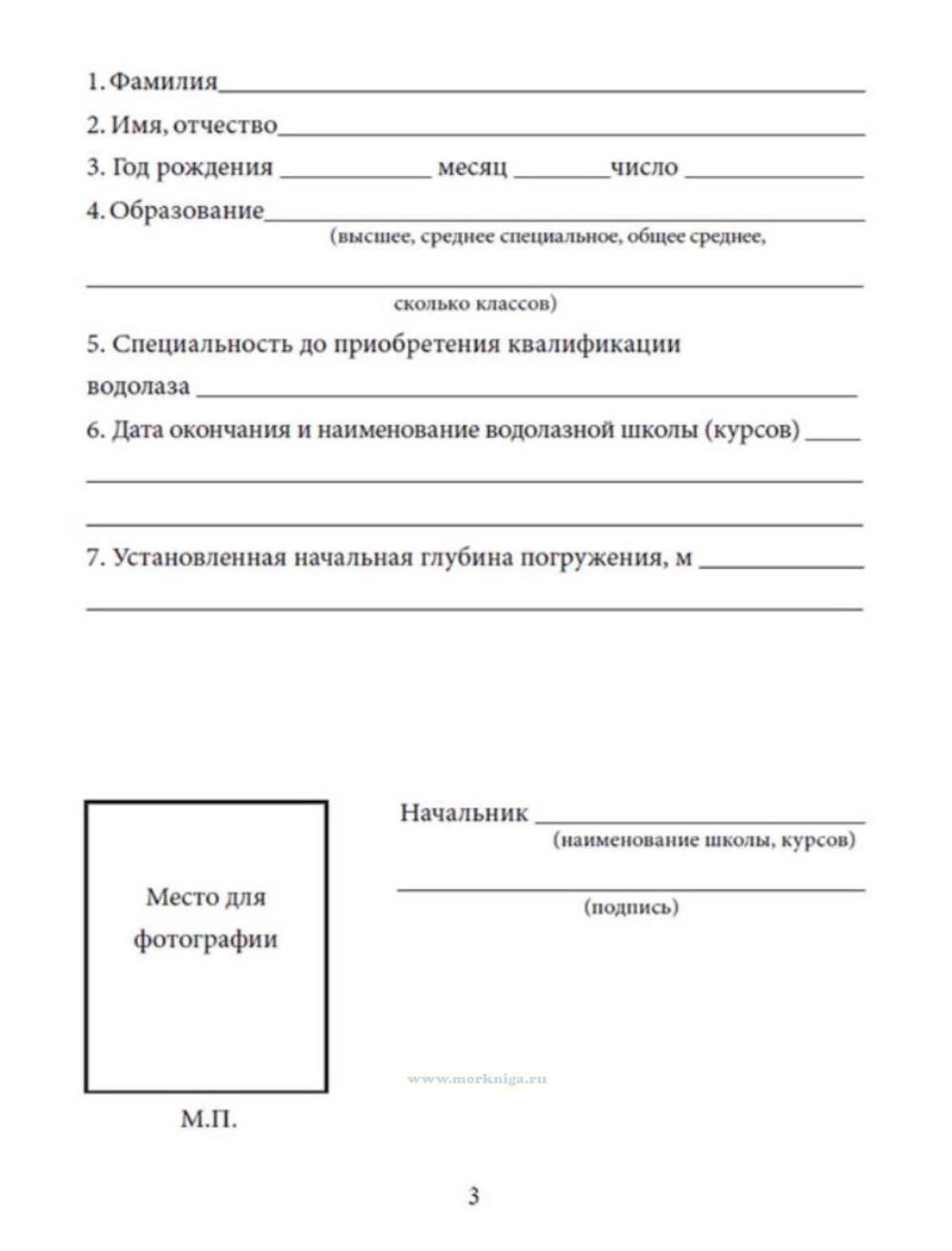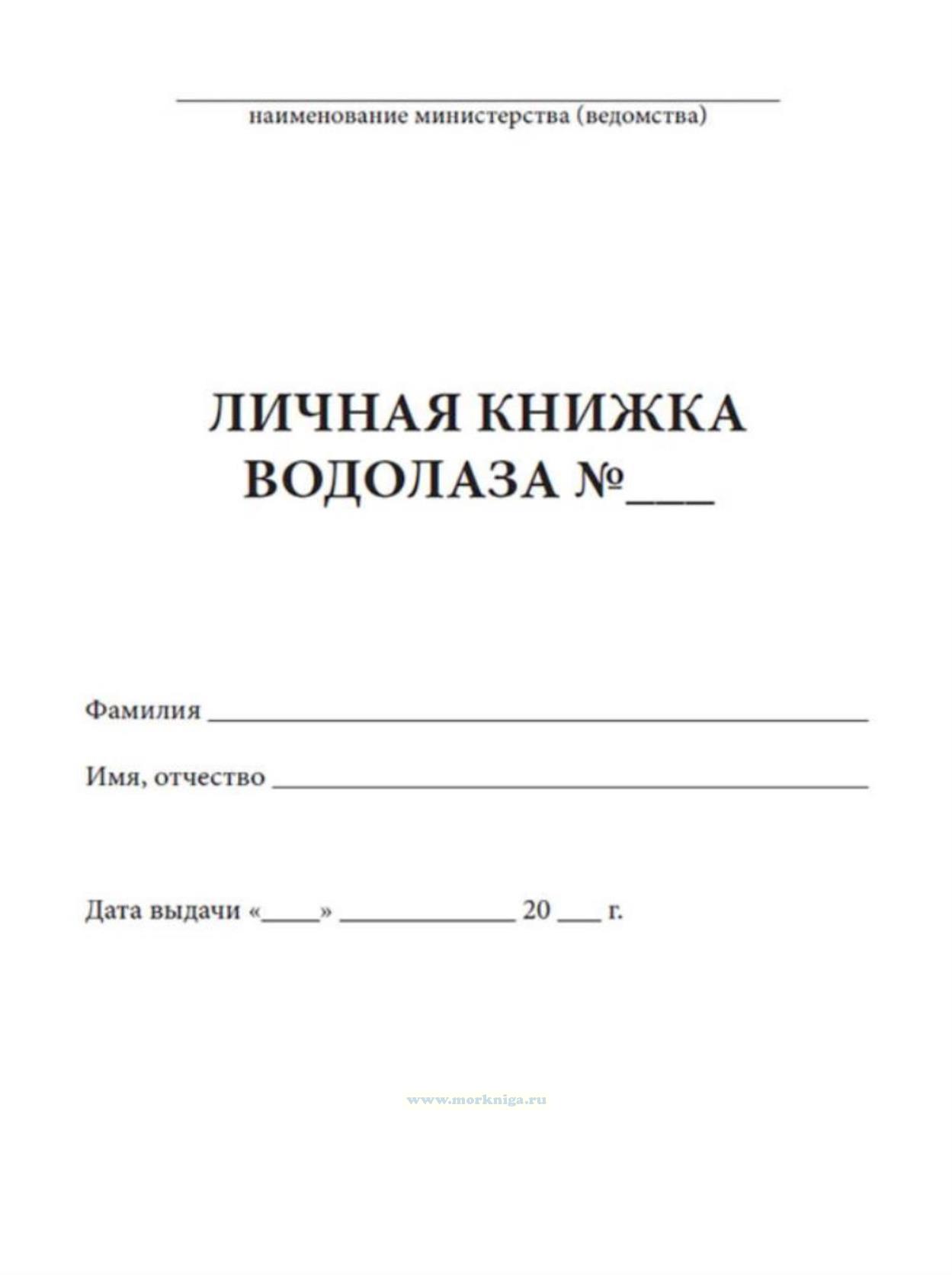 1. Личная книжка водолаза является единым документом для водолазов всех министерств и ведомств. Ее выдают но месту обучения лицам, получившим первоначальную водолазную подготовку, после присвоения им водолазной квалификации.
