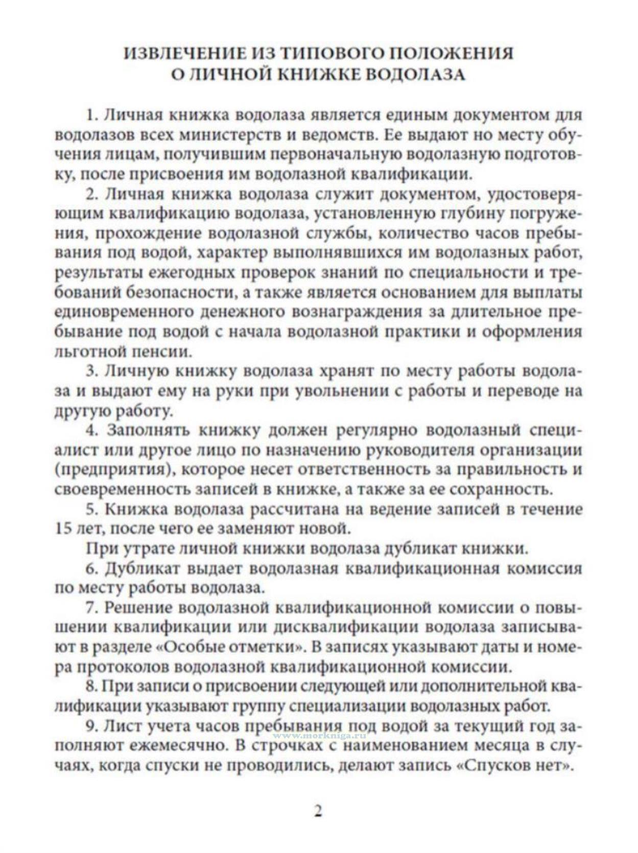 2. Личная книжка водолаза служит документом, удостоверяющим квалификацию водолаза, установленную глубину погружения, прохождение водолазной службы, количество часов пребывания под водой, характер выполнявшихся им водолазных работ, результаты ежегодных проверок знаний по специальности и требований безопасности, а также является основанием для выплаты единовременного денежного вознаграждения за длительное пребывание под водой с начала водолазной практики и оформления льготной пенсии.