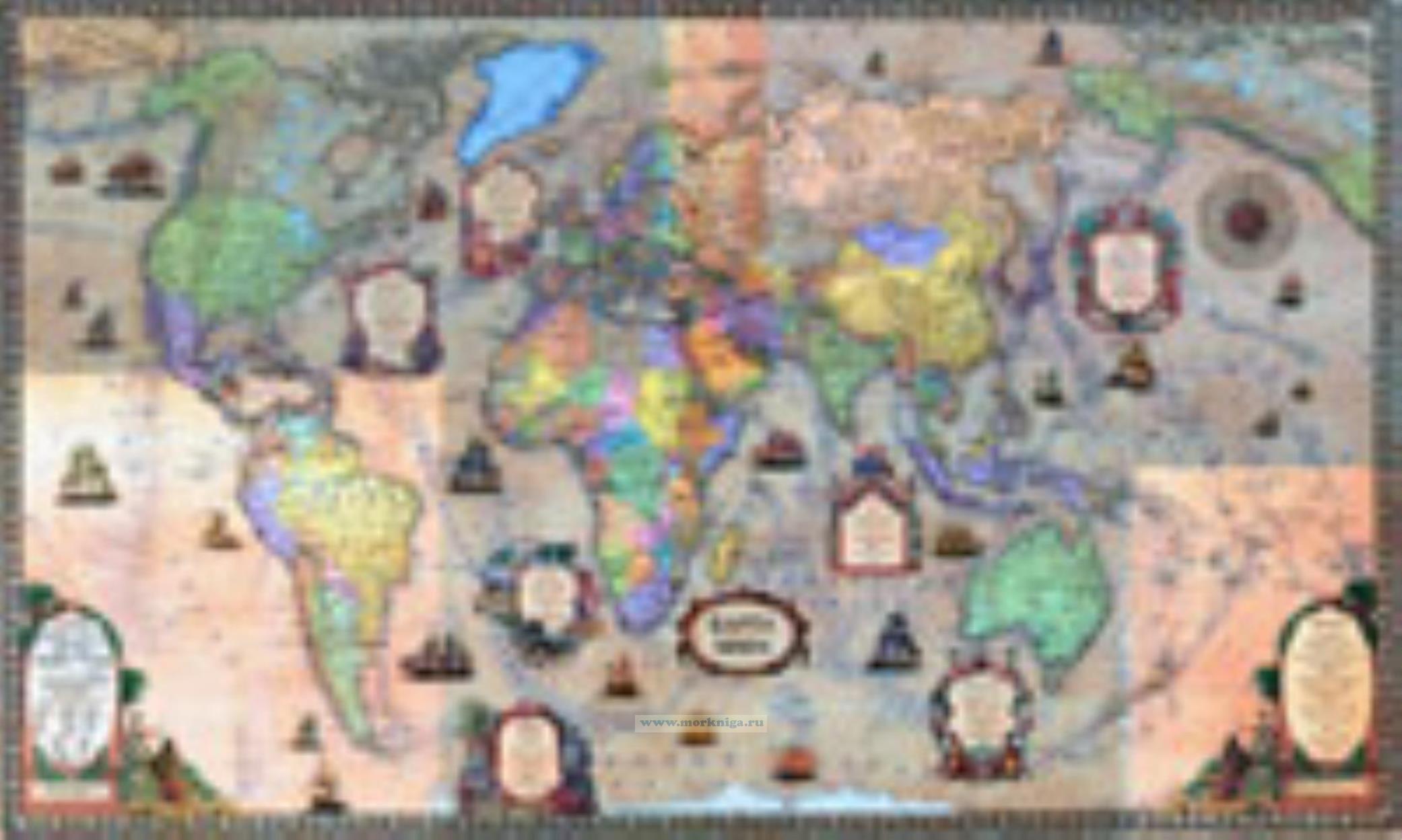 Эта интересная политическая карта дает представление о современном политическом устройстве мира, но своим дизайном напоминает карты, которые делали в старину. Ретро-карты очень популярны для домашнего и офисного оформления, потому что удачно вписываются в интерьер благодаря своей расцветке. На этой карте показаны границы государств, столицы и крупные населенные пункты, а также объекты гидрографии и их подписи. Карта мира в стиле ретро станет оригинальным украшением домашнего интерьера или вашего кабинета.