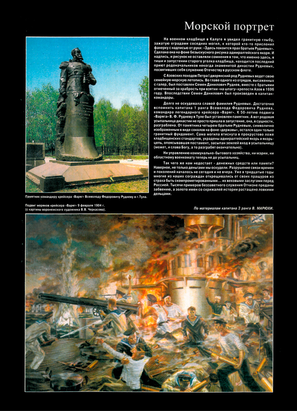В первом номере альманаха был опубликован материал о первом командующем Северной флотилией воронежце 3. Закупневе. Автор статьи капитан I ранга В. Расторгуев встретился с сыном легендарного красного командира, павшего жертвой сталинских репрессий в 1937 г., а в 1999 году была опубликована повесть В.З. Закупнева под редакцией В.И. Расторгуева "Флагман из Терновки". Мы публикуем открытое письмо потомственного моряка В.З.Закупнева.