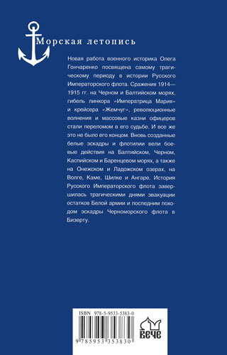 Новая работа военного историка О. Гончаренко посвящена самому трагическому периоду в истории Русского Императорского флота. Сражения 1914-1915 гг. на Черном и Балтийском морях, гибель линкора "Императрица Мария" и крейсера "Жемчуг", революционные волнения и массовые казни офицеров стали переломом в его судьбе. И все же это не было гибелью флота. Вновь созданные белые эскадры и флотилии вели боевые действия на Балтийском, Черном, Каспийском и Баренцевом морях, а также на Онежском и Ладожском озерах, на Волге, Каме, Шилке и Ангаре.