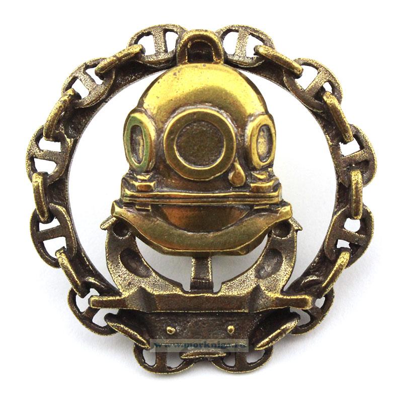 В центре знака помещен позолоченный накладной бронзовый трехболтовый водолазный шлем.