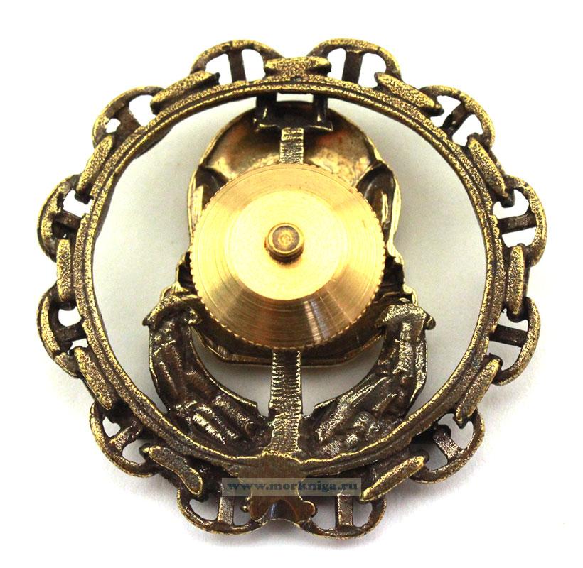 Нагрудный знак водолаз представляет собой металлический выпуклый якорь в круглом венчике из якорь-цепи с распорками.Якорь и якорь-цепь оксидированы.