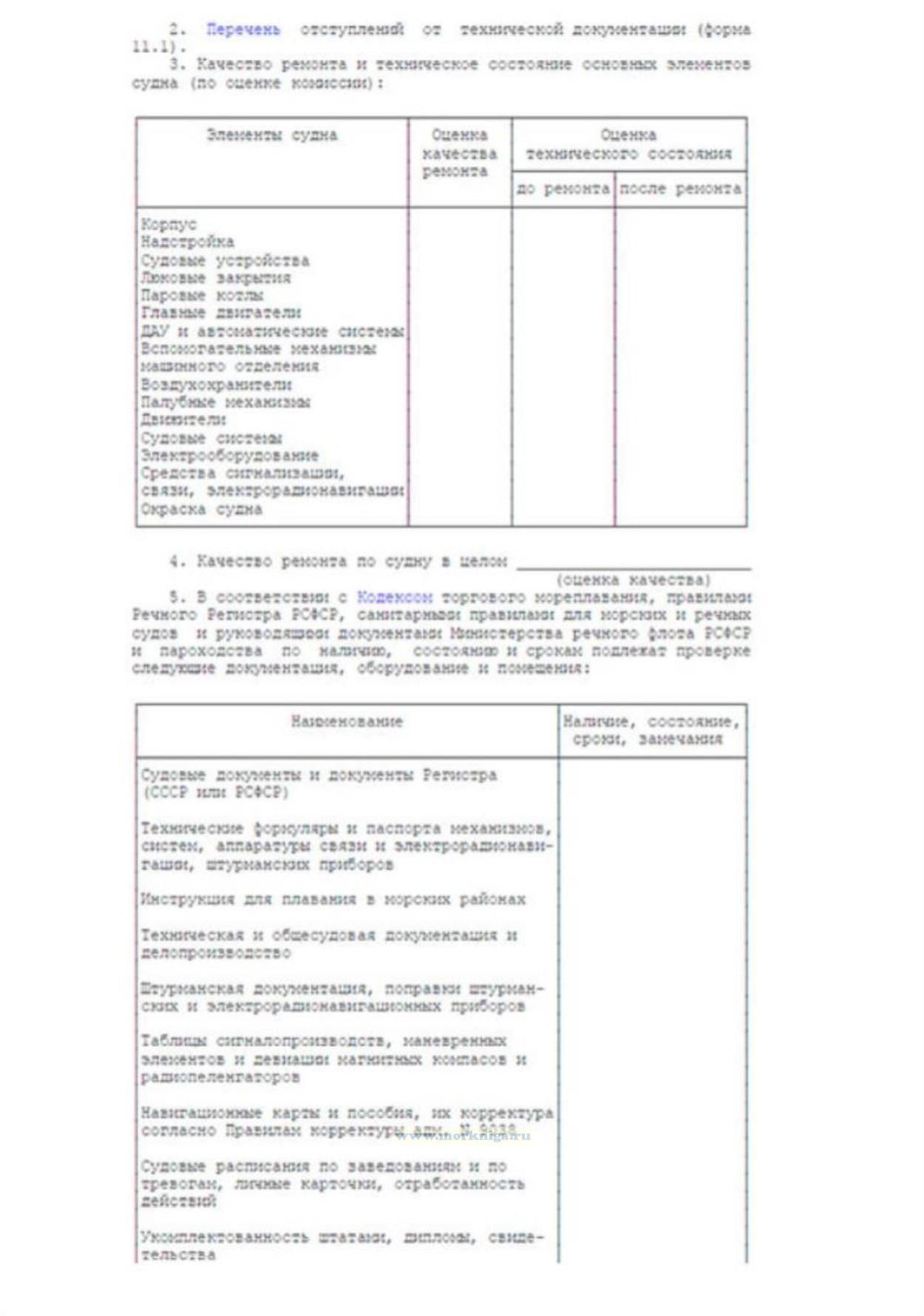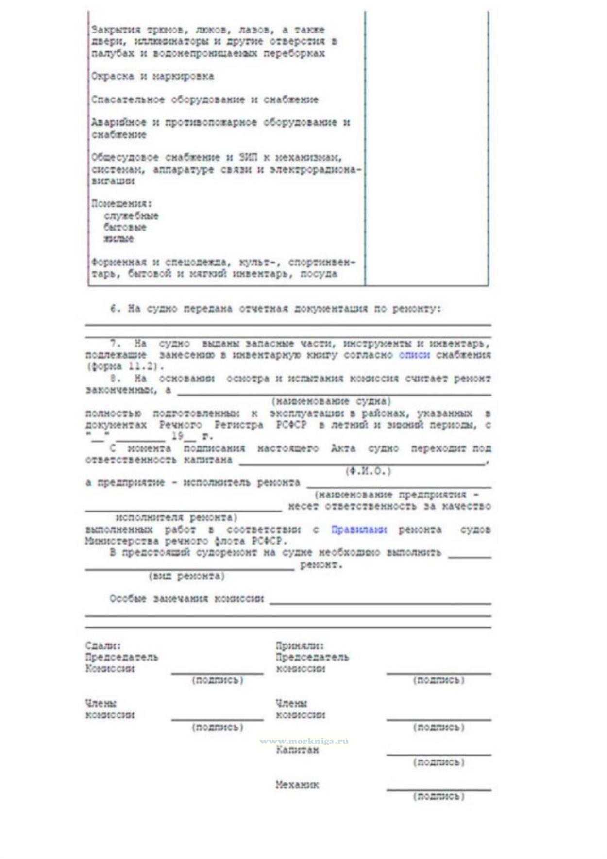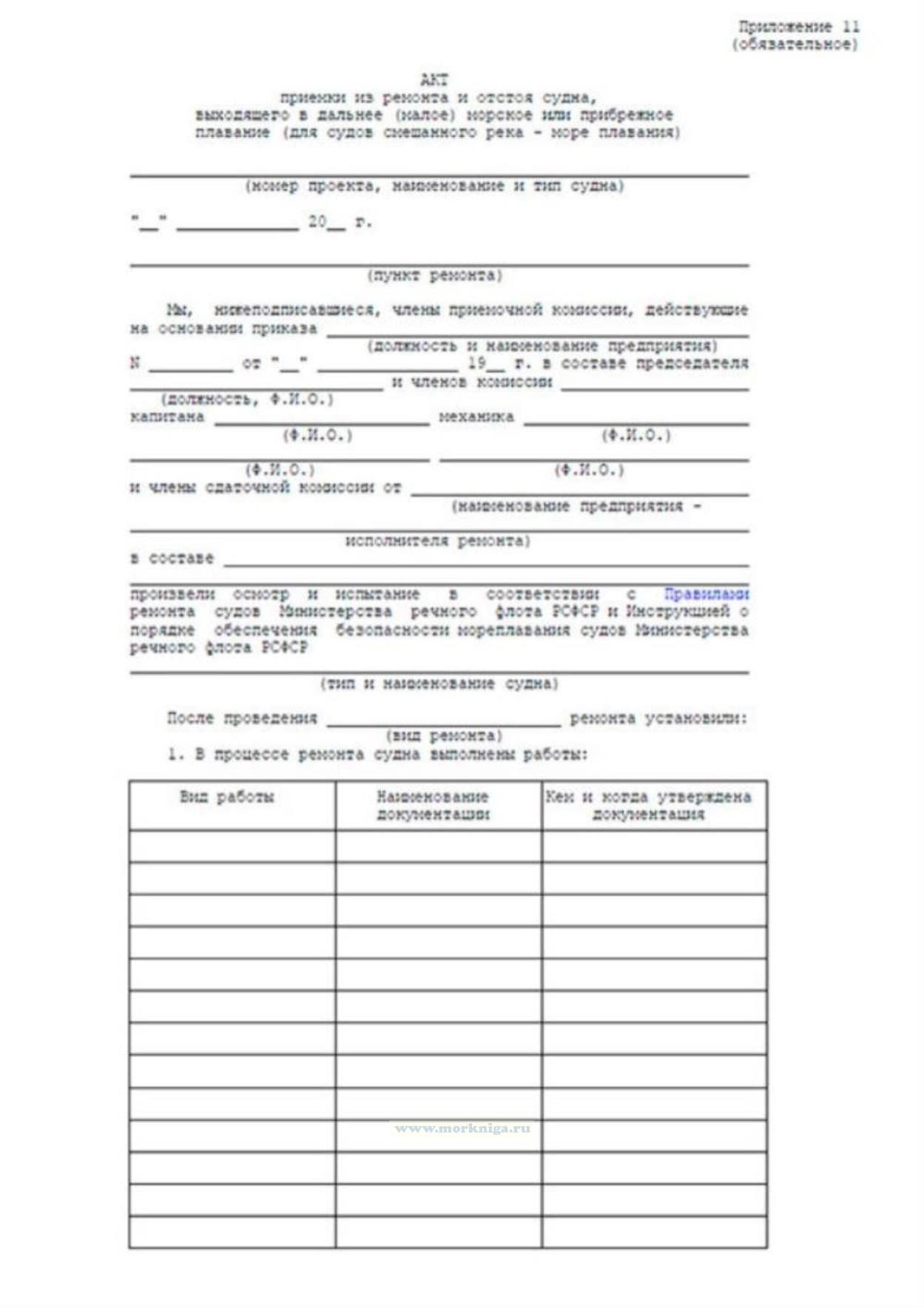 Форма акта приемки из ремонта и отстоя самоходного судна, выходящего в дальнее (малое) морское или прибрежное плавание (для судов смешанного река-море плавания) соответствует Приложению 11 к Приказу Минречфлота РСФСР от 12.05.1989 N 61 "О введении в действие Правил ремонта судов Министерства речного флота РСФСР", который утратил силу.