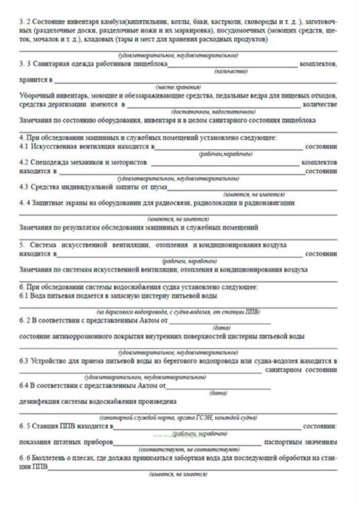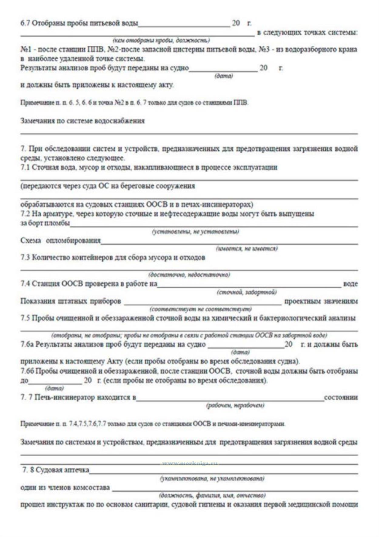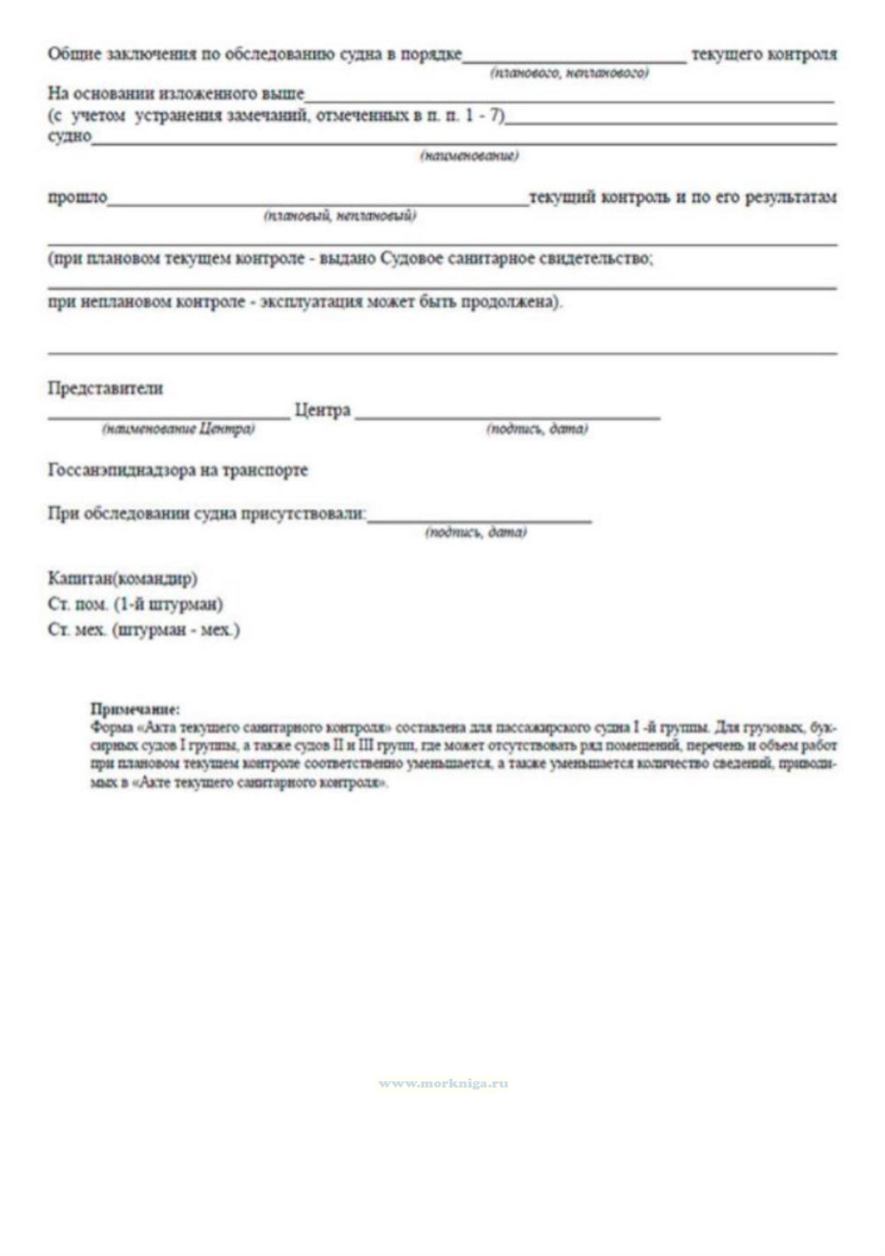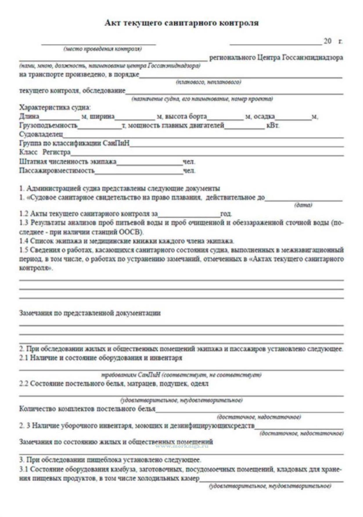 Форма акта текущего санитарного контроля соответствует Приложению 8 к СанПину 2.5.2-703-98 Санитарные правила для судов внутреннего и смешанного (река-море) плавания, который утратил силу.