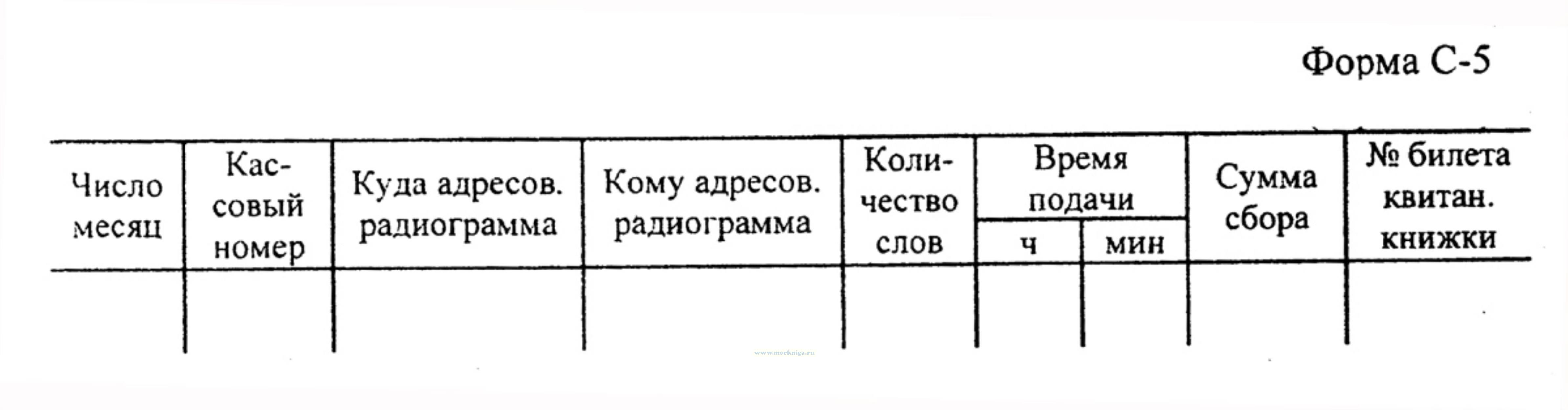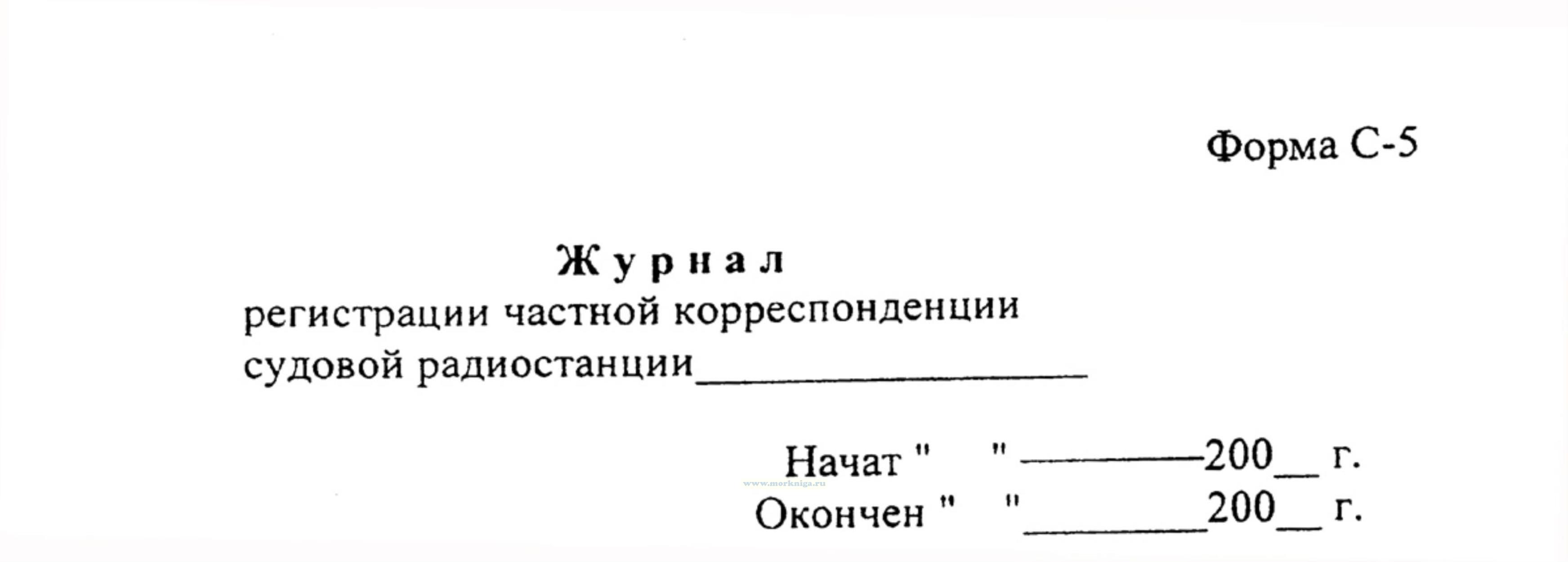 Форма журнала регистрации частной корреспонденции судовой радиостанции (С-5) соответвует Приложению 2 к Правилам радиосвязи на ВВП РФ.