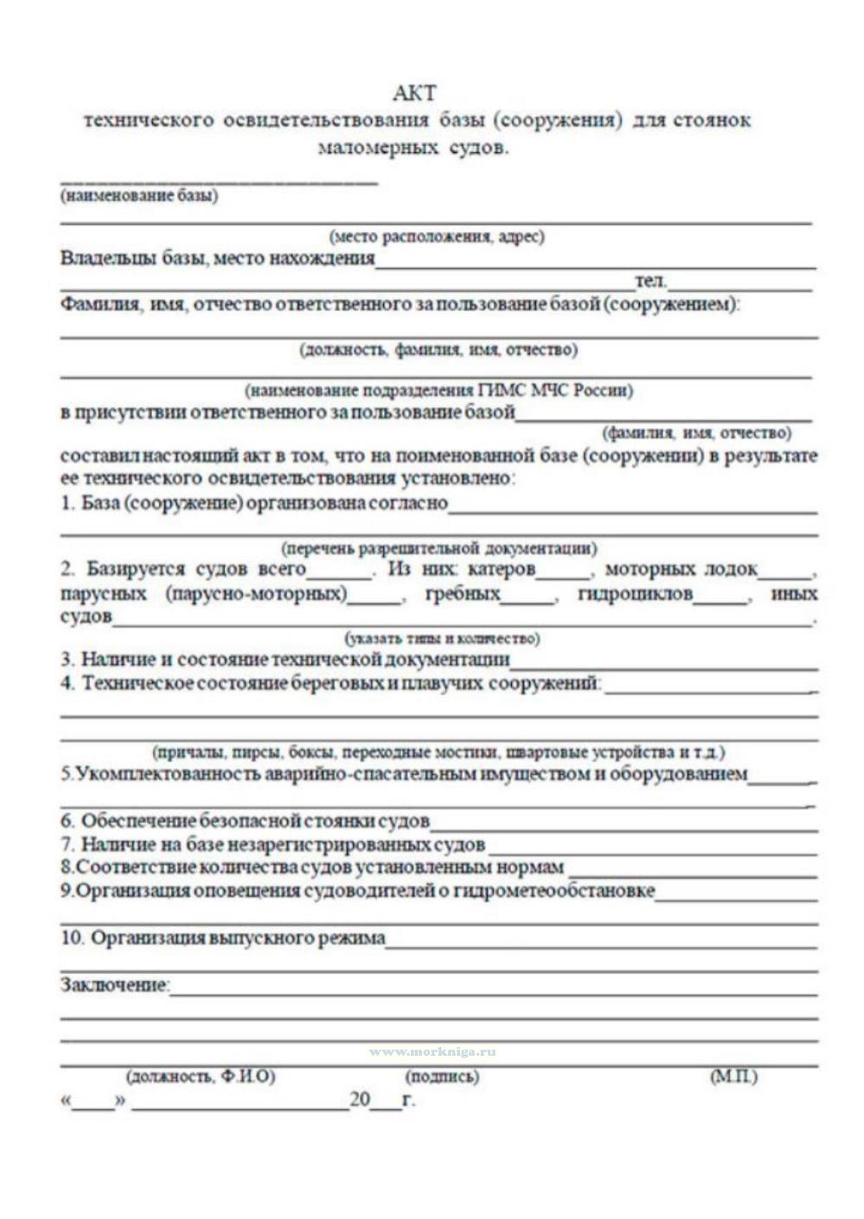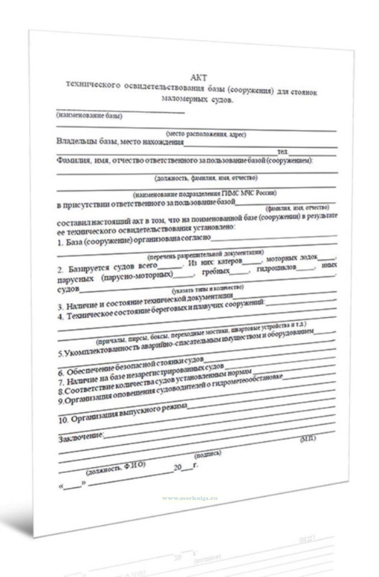 Форма акта технического освидетельствования базы (сооружения) для стоянок маломерных судов соответствует Приложению 2 к Приказу МЧС РФ от 29.06.2005 N 50 "Об утверждении Правил технического надзора за маломерными судами, поднадзорными Государственной инспекции по маломерным судам Министерства Российской Федерации по делам гражданской обороны, чрезвычайным ситуациям и ликвидации последствий стихийных бедствий, базами (сооружениями) для их стоянок, пляжами и другими местами массового отдыха на водоемах, переправами и наплавными мостами", который утратил силу.